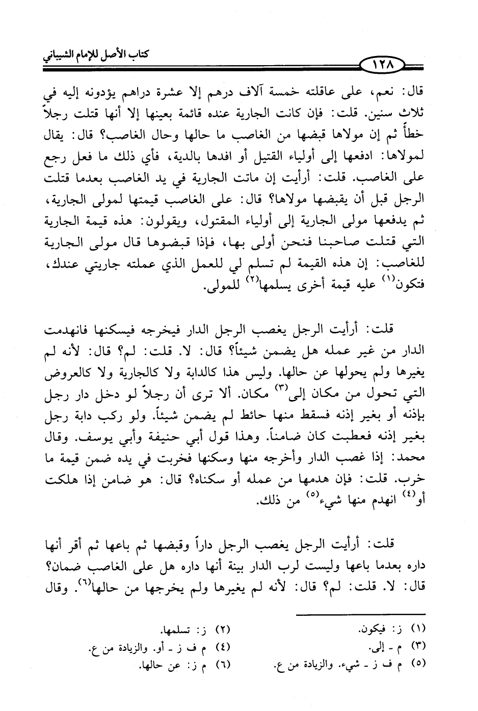 قال: نعم، على عاقلته خمسة آلاف درهم إلا عشرة دراهم يؤدونه إليه في ثلاث سنين. قلت: فإن كانت الجارية عنده قائمة بعينها إلا أنها قتلت رجلاً خطأً ثم إن مولاها قبضها من الغاصب ما حالها وحال الغاصب؟ قال: يقال لمولاها: ادفعها إلى أولياء القتيل أو افدها بالدية، فأي ذلك ما فعل رجع على الغاصب. قلت: أرأيت إن ماتت الجارية في يد الغاصب بعدما قتلت الرجل قبل أن يقبضها مولاها؟ قال: على الغاصب قيمتها لمولى الجارية، ثم يدفعها مولى الجارية إلى أولياء المقتول، ويقولون: هذه قيمة الجارية التي قتلت صاحبنا فنحن أولى بها، فإذا قبضوها قال مولى الجارية للغاصب: إن هذه القيمة لم تسلم لي للعمل الذي عملته جاريتي عندك، فتكون (¬1) عليه قيمة أخرى يسلمها (¬2) للمولى.