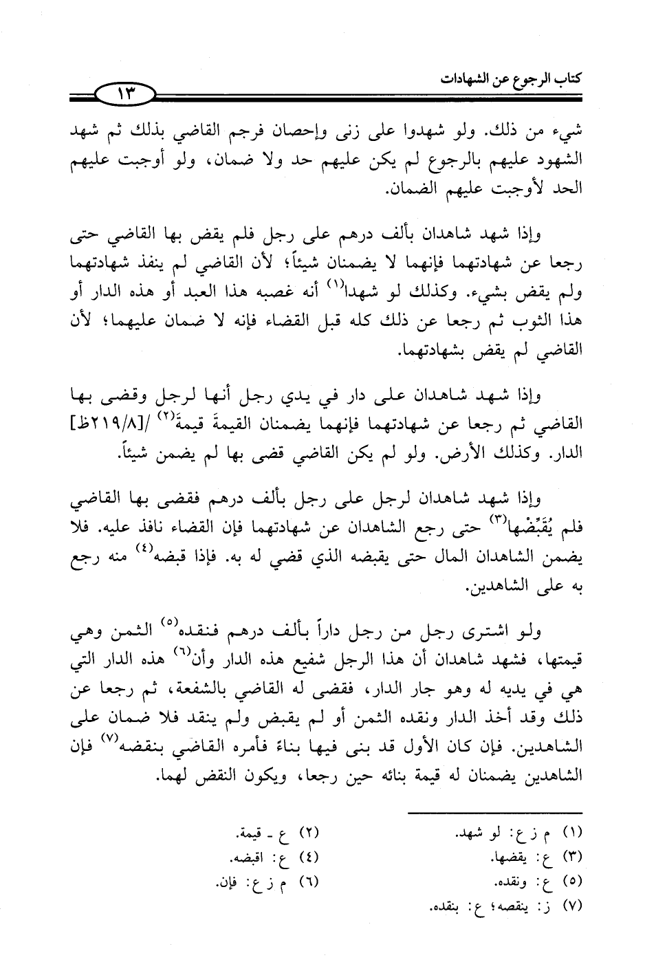 شيء من ذلك. ولو شهدوا على زنى وإحصان فرجم القاضي بذلك ثم شهد الشهود عليهم بالرجوع لم يكن عليهم حد ولا ضمان، ولو أوجبت عليهم الحد لأوجبت عليهم الضمان.