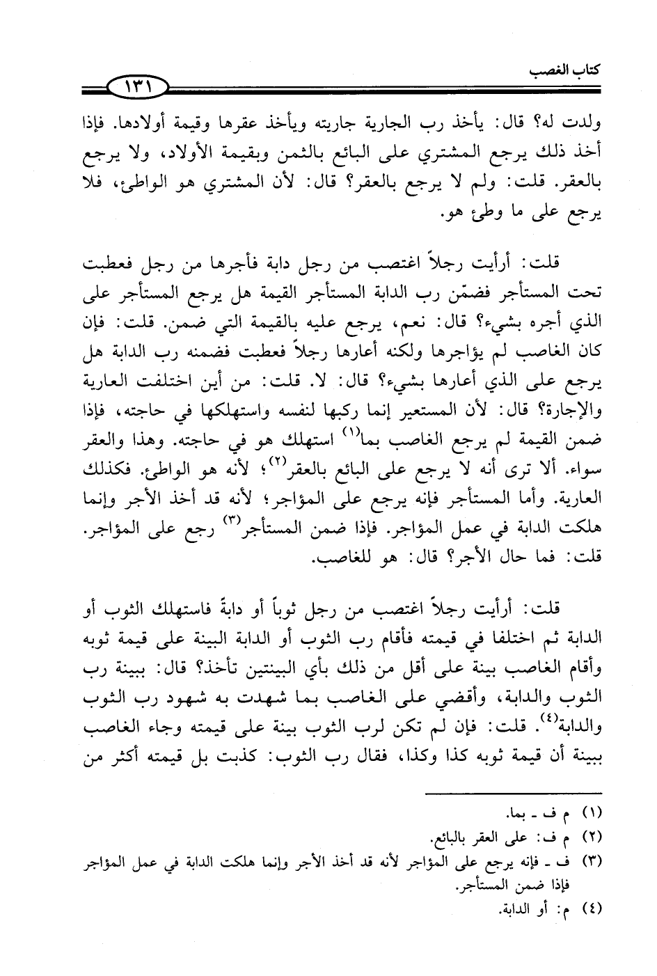 قلت: أرأيت رجلاً اغتصب من رجل ثوباً أو دابةً فاستهلك الثوب أو الدابة ثم اختلفا في قيمته فأقام رب الثوب أو الدابة البينة على قيمة ثوبه وأقام الغاصب بينة على أقل من ذلك بأي البينتين تأخذ؟ قال: ببينة رب الثوب والدابة، وأقضي على الغاصب بما شهدت به شهود رب الثوب والدابة (¬4). قلت: فإن لم تكن لرب الثوب بينة على قيمته وجاء الغاصب ببينة أن قيمة ثوبه كذا وكذا، فقال رب الثوب: كذبت بل قيمته أكثر من