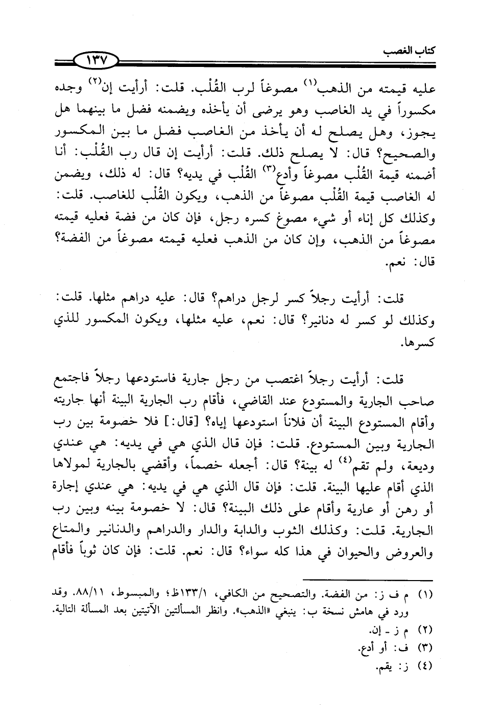 (¬1) م ف ز: من الفضة. والتصحيح من الكافي، 1/ 133 ظ؛ والمبسوط، 11/ 88. وقد ورد في هامش نسخة ب: ينبغي "الذهب". وانظر المسألتين الآتيتين بعد المسألة التالية.
