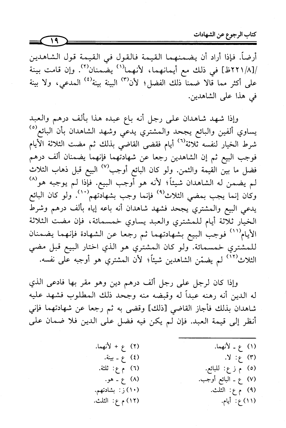 وإذا شهد شاهدان على رجل أنه باع عبده هذا بألف درهم والعبد يساوي ألفين والبائع يجحد والمشتري يدعي وشهد الشاهدان بأن البائع (¬5) شرط الخيار لنفسه ثلاثة (¬6) أيام فقضى القاضي بذلك ثم مضت الثلاثة الأيام فوجب البيع ثم إن الشاهدين رجعا عن شهادتهما فإنهما يضمنان ألف درهم فضل ما بين القيمة والثمن. ولو كان البائع أوجب (¬7) البيع قبل ذهاب الثلاث لم يضمن له الشاهدان شيئاً؛ لأنه هو أوجب البيع. فإذا لم يوجبه هو (¬8) وكان إنما يجب بمضي الثلاث (¬9) فإنما وجب بشهادتهم (¬10). ولو كان البائع يدعي البيع والمشتري يجحد فشهد شاهدان أنه باعه إياه بألف درهم وشرط الخيار ثلاثة أيام للمشتري والعبد يساوي خمسمائة، فإن مضت الثلاثة الأيام (¬11) فوجب البيع بشهادتهما ثم رجعا عن الشهادة فإنهما يضمنان للمشتري خمسمائة. ولو كان المشتري هو الذي اختار البيع قبل مضي الثلاث (¬12) لم يضمّن الشاهدين شيئاً، لأن المشتري هو أوجبه على نفسه.