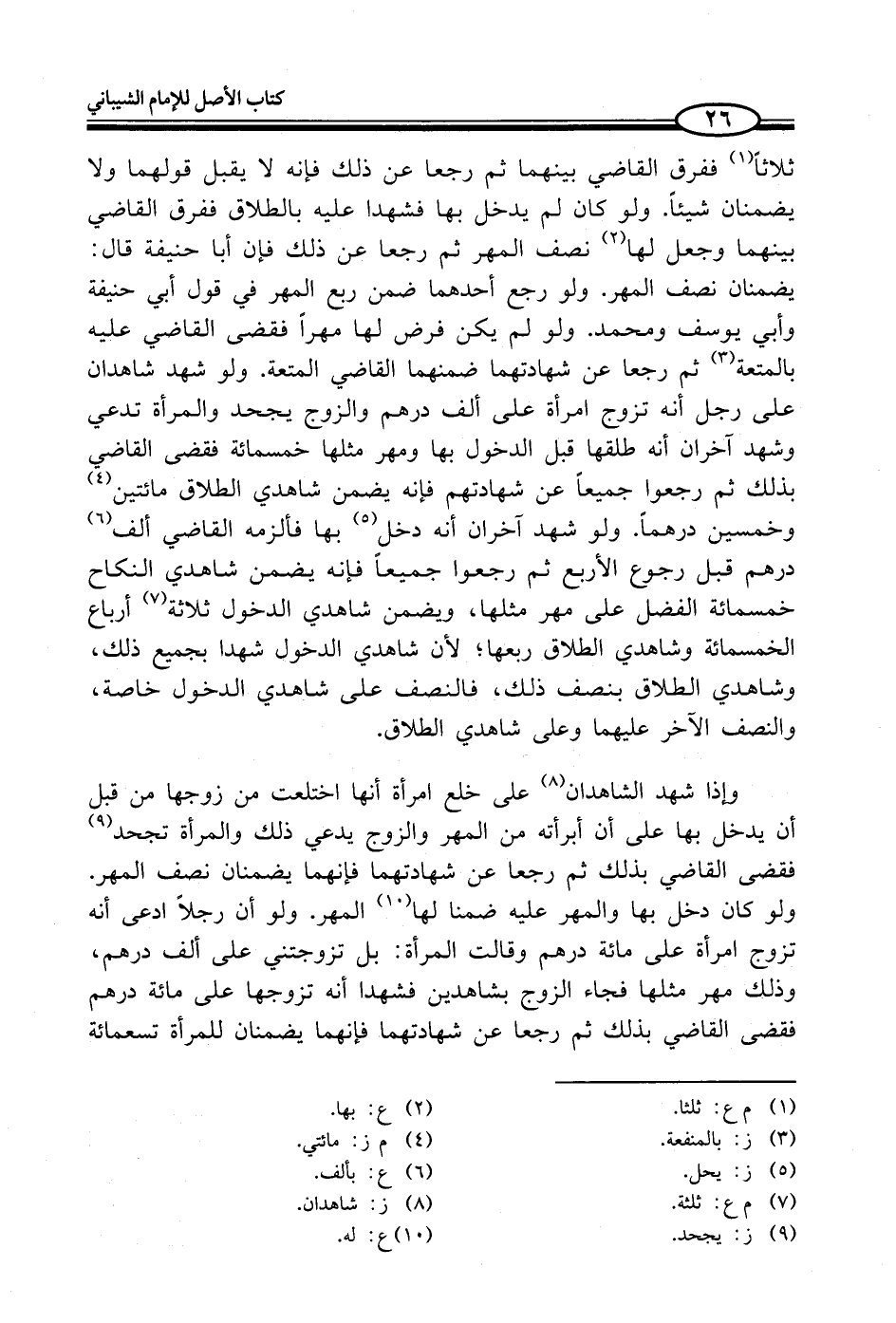 ثلاثاً (¬1) ففرق القاضي بينهما ثم رجعا عن ذلك فإنه لا يقبل قولهما ولا يضمنان شيئاً. ولو كان لم يدخل بها فشهدا عليه بالطلاق ففرق القاضي بينهما وجعل لها (¬2) نصف المهر ثم رجعا عن ذلك فإن أبا حنيفة قال: يضمنان نصف المهر. ولو رجع أحدهما ضمن ربع المهر في قول أبي حنيفة وأبي يوسف ومحمد. ولو لم يكن فرض لها مهراً فقضى القاضي عليه بالمتعة (¬3) ثم رجعا عن شهادتهما ضمنهما القاضي المتعة. ولو شهد شاهدان على رجل أنه تزوج امرأة على ألف درهم والزوج يجحد والمرأة تدعي وشهد آخران أنه طلقها قبل الدخول بها ومهر مثلها خمسمائة فقضى القاضي بذلك ثم رجعوا جميعاً عن شهادتهم فإنه يضمن شاهدي الطلاق مائتين (¬4) وخمسين درهماً. ولو شهد آخران أنه دخل (¬5) بها فألزمه القاضي ألف (¬6) درهم قبل رجوع الأربع ثم رجعوا جميعاً فإنه يضمن شاهدي النكاح خمسمائة الفضل على مهر مثلها، ويضمن شاهدي الدخول ثلاثة (¬7) أرباع الخمسمائة وشاهدي الطلاق ربعها؛ لأن شاهدي الدخول شهدا بجميع ذلك، وشاهدي الطلاق بنصف ذلك، فالنصف على شاهدي الدخول خاصة، والنصف الآخر عليهما وعلى شاهدي الطلاق.
