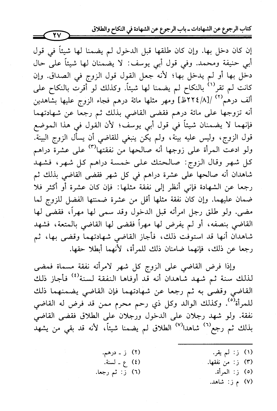 وإذا فرض القاضي على الزوج كل شهر لامرأته نفقة مسماة فمضى لذلك سنة ثم شهد شاهدان أنه قد أوفاها النفقة لسنة (¬4) فأجاز ذلك القاضي وقضى به ثم رجعا عن شهادتهما فإن القاضي يضمنهما ذلك للمرأة (¬5). وكذلك الوالد وكل ذي رحم محرم ممّن قد فرض له القاضي نفقة. ولو شهد رجلان على الدخول ورجلان على الطلاق فقضى القاضي بذلك ثم رجع (¬6) شاهدا (¬7) الطلاق لم يضمنا شيئاً، لأنه قد بقي من يشهد
