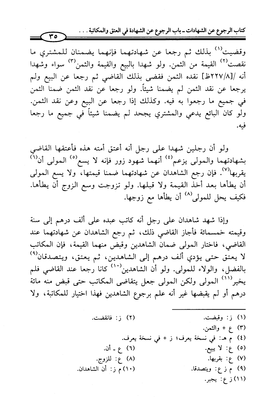 وقضيت (¬1) بذلك ثم رجعا عن شهادتهما فإنهما يضمنان للمشتري ما نقصت (¬2) القيمة من المْن. ولو شهدا بالبيع والقيمة والثّمن (¬3) سواء وشهدا أنه نقده الثمن فقضى بذلك القاضي ثم رجعا عن البيع ولم يرجعا عن نقد الثمن لم يضمنا شيئاً. ولو رجعا عن نقد الثمن ضمنا الثمن في جميع ما رجعوا به فيه. وكذلك إذا رجعا عن البيع وعن نقد الثمن. ولو كان البائع يدعي والمشتري يجحد لم يضمنا شيئاً في جميع ما رجعا فيه.