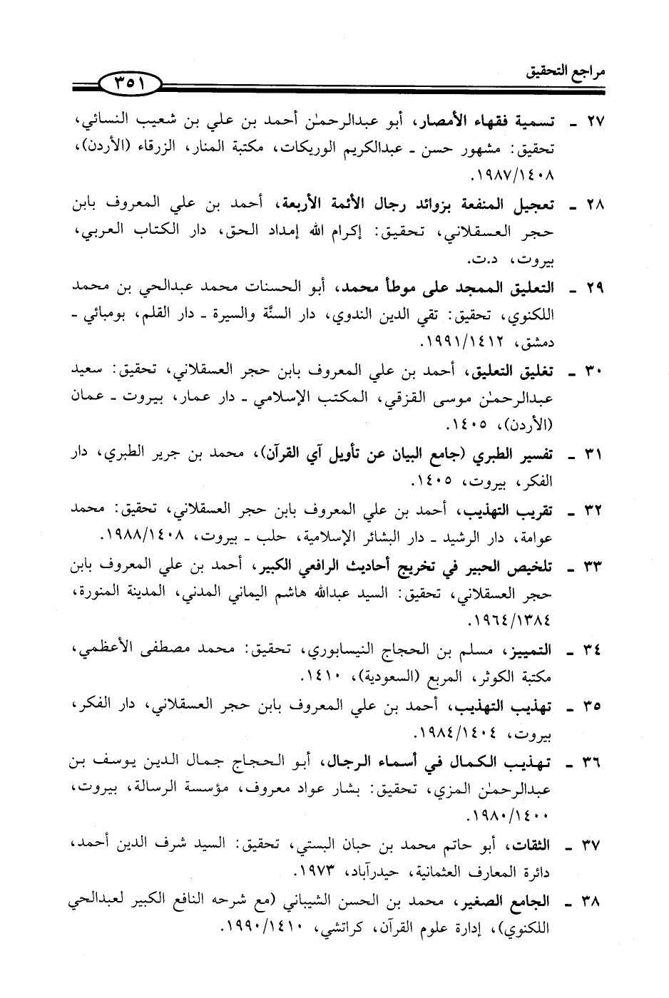28 - تعجيل المنفعة بزوائد رجال الأئمة الاْربعة، أحمد بن علي المعروف بابن حجر العسقلاني، تحقيق: إكرام الله إمداد الحق، دار الكتاب العربي، بيروت، د. ت.