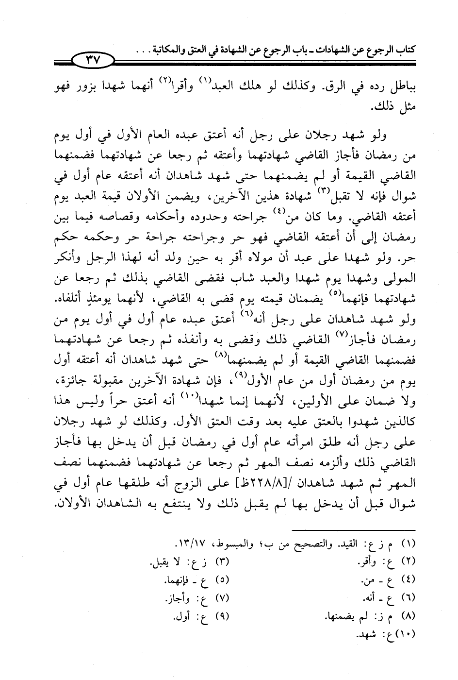 ولو شهد رجلان على رجل أنه أعتق عبده العام الأول في أول يوم من رمضان فأجاز القاضي شهادتهما وأعتقه ثم رجعا عن شهادتهما فضمنهما القاضي القيمة أو لم يضمنهما حتى شهد شاهدان أنه أعتقه عام أول في شوال فإنه لا تقبل (¬3) شهادة هذين الآخرين، ويضمن الأولان قيمة العبد يوم أعتقه القاضي. وما كان من (¬4) جراحته وحدوده وأحكامه وقصاصه فيما بين رمضان إلى أن أعتقه القاضي فهو حر وجراحته جراحة حر وحكمه حكم حر. ولو شهدا على عبد أن مولاه أقر به حين ولد أنه لهذا الرجل وأنكر المولى وشهدا يوم شهدا والعبد شاب فقضى القاضي بذلك ثم رجعا عن شهادتهما فإنهما (¬5) يضمنان قيمته يوم قضى به القاضي، لأنهما يومئذٍ أتلفاه. ولو شهد شاهدان على رجل أنه (¬6) أعتق عبده عام أول في أول يوم من رمضان فأجاز (¬7) القاضي ذلك وقضى به وأنفذه ثم رجعا عن شهادتهما فضمنهما القاضي القيمة أو لم يضمنهما (¬8) حتى شهد شاهدان أنه أعتقه أول يوم من رمضان أول من عام الأول (¬9)، فإن شهادة الآخرين مقبولة جائزة، ولا ضمان على الأولين، لأنهما إنما شهدا (¬10) أنه أعتق حراً وليس هذا كالذين شهدوا بالعتق عليه بعد وقت العتق الأول. وكذلك لو شهد رجلان على رجل أنه طلق امرأته عام أول في رمضان قبل أن يدخل بها فأجاز القاضي ذلك وألزمه نصف المهر ثم رجعا عن شهادتهما فضمنهما نصف المهر ثم شهد شاهدان على الزوج أنه طلقها عام أول في شوال قبل أن يدخل بها لم يقبل ذلك ولا ينتفع به الشاهدان الأولان.