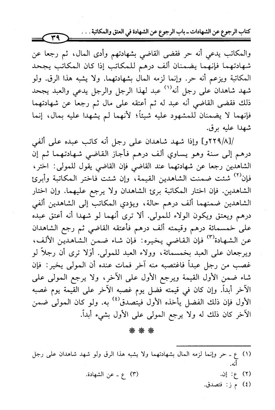 والمكاتب يدعي أنه حر فقضى القاضي بشهادتهم وأدى المال، ثم رجعا عن شهادتهما فإنهما يضمنان ألف درهم للمكاتب إذا كان المكاتب يجحد المكاتبة ويزعم أنه حر. وإنما لزمه المال بشهادتهما. ولا يشبه هذا الرق. ولو شهد شاهدان على رجل أنه (¬1) عبد لهذا الرجل والرجل يدعي والعبد يجحد ذلك فقضى القاضي أنه عبد له ثم أعتقه على مال ثم رجعا عن شهادتهما فإنهما لا يضمنان للمشهود عليه شيئاً؛ لأنهما لم يشهدا عليه بمال، إنما شهدا عليه برق.
