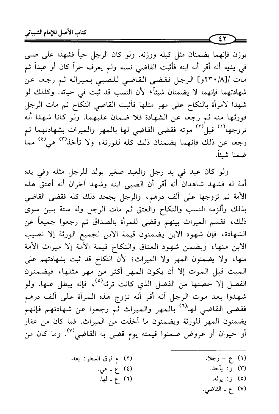 ولو كان عبد في يد رجل والعبد صغير يولد للرجل مثله وفي يده أمة له فشهد شاهدان أنه أقر أن الصبي ابنه وشهد آخران أنه أعتق هذه الأمة ثم تزوجها على ألف درهم، والرجل يجحد ذلك كله فقضى القاضي بذلك وألزمه النسب والنِّكاح والعتق ثم مات الرجل وله ستة بنين سوى ذلك، فقسم الميراث بينهم وقضى للمرأة بالصداق ثم رجعوا جميعاً عن الشهادة، فإن شهود الابن يضمنون قيمة الابن لجميع الورثة إِلا نصيب الابن منها، ويضمن شهود العتاق والنِّكاح قيمة الأمة إِلا ميراث الأمة منها، ولا يضمنون المهر ولا الميراث، لأن النكاح قد ثبت بشهادتهم على الميت قبل الموت إِلا أن يكون المهر أكثر من مهر مثلها، فيضمنون الفضل إِلا حصتها من الفضل الذي كانت ترثه (¬5)، فإنه يبطل عنها. ولو شهدوا بعد موت الرجل أنه أقر أنه تزوج هذه المرأة على ألف درهم فقضى القاضي لها (¬6) بالمهر والميراث ثم رجعوا عن شهادتهم فإنهم يضمنون المهر للورثة ويضمنون ما أخذت من الميراث. فما كان من عقار أو حيوان أو عروض ضمنوا قيمته يوم قضى به القاضي (¬7). وما كان من