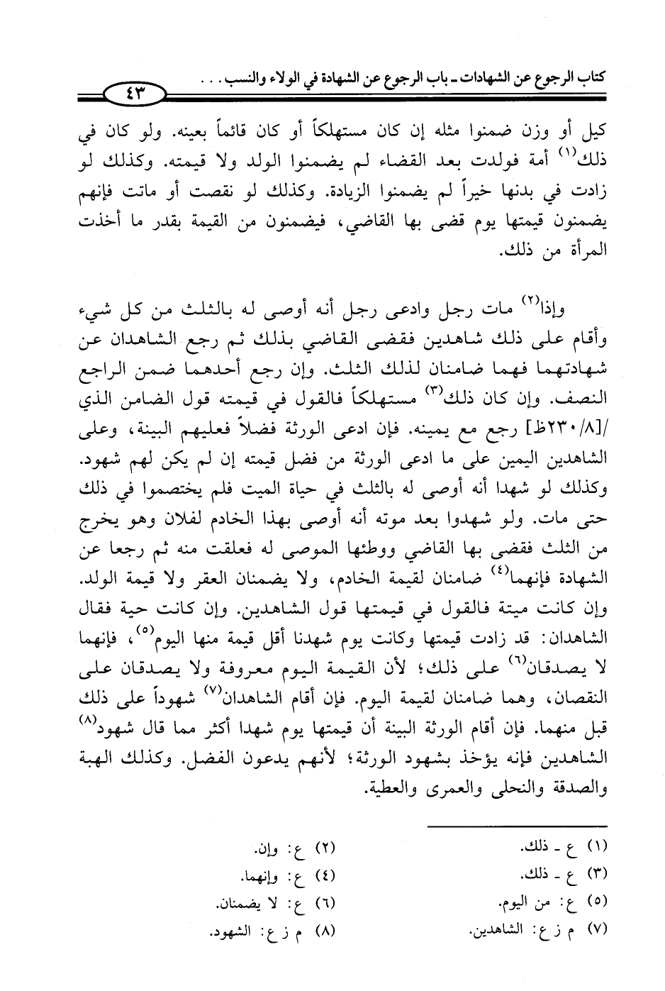 وإذا (¬2) مات رجل وادعى رجل أنه أوصى له بالثلث من كل شيء وأقام على ذلك شاهدين فقضى القاضي بذلك ثم رجع الشاهدان عن شهادتهما فهما ضامنان لذلك الثلث. وإن رجع أحدهما ضمن الراجع النّصف. وإن كان ذلك (¬3) مستهلكاً فالقول في قيمته قول الضامن الذي رجع مع يمينه. فإن ادعى الورثة فضلاً فعليهم البينة، وعلى الشاهدين اليمين على ما ادعى الورثة من فضل قيمته إن لم يكن لهم شهود. وكذلك لو شهدا أنه أوصى له بالثلث في حياة الميت فلم يختصموا في ذلك حتى مات. ولو شهدوا بعد موته أنه أوصى بهذا الخادم لفلان وهو يخرج من الثلث فقضى بها القاضي ووطئها الموصى له فعلقت منه ثم رجعا عن الشهادة فإنهما (¬4) ضامنان لقيمة الخادم، ولا يضمنان العقر ولا قيمة الولد. وإن كانت ميتة فالقول في قيمتها قول الشاهدين. وإن كانت حية فقال الشاهدان: قد زادت قيمتها وكانت يوم شهدنا أقل قيمة منها اليوم (¬5)، فإنهما لا يصدقان (¬6) على ذلك؛ لأن القيمة اليوم معروفة ولا يصدقان على النقصان، وهما ضامنان لقيمة اليوم. فإن أقام الشاهدان (¬7) شهوداً على ذلك قبل منهما. فإن أقام الورثة البينة أن قيمتها يوم شهدا أكثر مما قال شهود (¬8) الشاهدين فإنه يؤخذ بشهود الورثة؛ لانهم يدعون الفضل. وكذلك الهِبَة والصدقة والنحلى والعمرى والعطية.