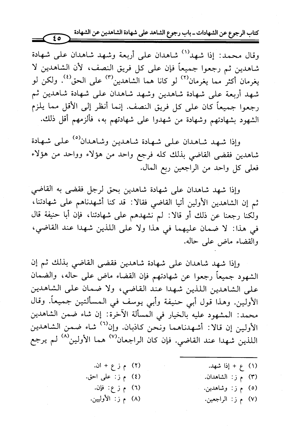 وقال محمد: إذا شهد (¬1) شاهدان على أربعة وشهد شاهدان على شهادة شاهدين ثم رجعوا جميعاً فإن على كل فريق النصف، لأن الشاهدين لا يغرمان أكثر مما يغرمان (¬2) لو كانا هما الشاهدين (¬3) على الحق (¬4). ولكن لو شهد أربعة على شهادة شاهدين وشهد شاهدان على شهادة شاهدين ثم رجعوا جميعاً كان على كل فريق النصف. إنما أنظر إلى الأقل مما يلزم الشهود بشهادتهم وشهادة من شهدوا على شهادتهم به، فألزمهم أقل ذلك.