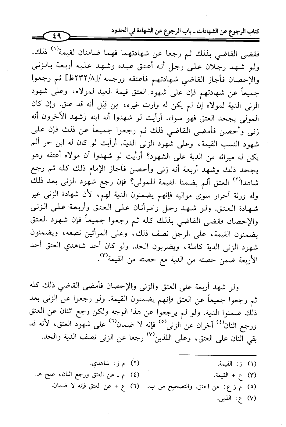 ولو شهد رجلان على رجل أنه أعتق عبده وشهد عليه أربعة بالزنى والإحصان فأجاز القاضي شهادتهم فأعتقه ورجمه ثم رجعوا جميعاً عن شهادتهم فإن على شهود العتق قيمة العبد لمولاه، وعلى شهود الزنى الدية لمولاه إن لم يكن له وارث غيره، مِن قِبَل أنه قد عتق. وإن كان المولى يجحد العتق فهو سواء. أرأيت لو شهدوا أنه ابنه وشهد الآخرون أنه زنى وأحصن فأمضى القاضي ذلك ثم رجعوا جميعاً عن ذلك فإن على شهود النسب القيمة، وعلى شهود الزنى الدية. أرأيت لو كان له ابن حر ألم يكن له ميراثه من الدية على الشهود؟ أرأيت لو شهدوا أن مولاه أعتقه وهو يجحد ذلك وشهد أربعة أنه زنى وأحصن فأجاز الإمام ذلك كله ثم رجع شاهدا (¬2) العتق ألم يضمنا القيمة للمولى؟ فإن رجع شهود الزنى بعد ذلك وله ورثة أحرار سوى مواليه فإنهم يضمنون الدية لهم، لأن شهادة الزنى غير شهادة العتق. ولو شهد رجل وامرأتان على العتق وأربعة على الزنى والإحصان فقضى القاضي بذلك كله ثم رجعوا جميعاً فإن شهود العتق يضمنون القيمة، على الرجل نصف ذلك، وعلى المرأتين نصفه، ويضمنون شهود الزنى الدية كاملة، ويضربون الحد. ولو كان أحد شاهدي العتق أحد الأربعة ضمن حصته من الدية مع حصته من القيمة (¬3).