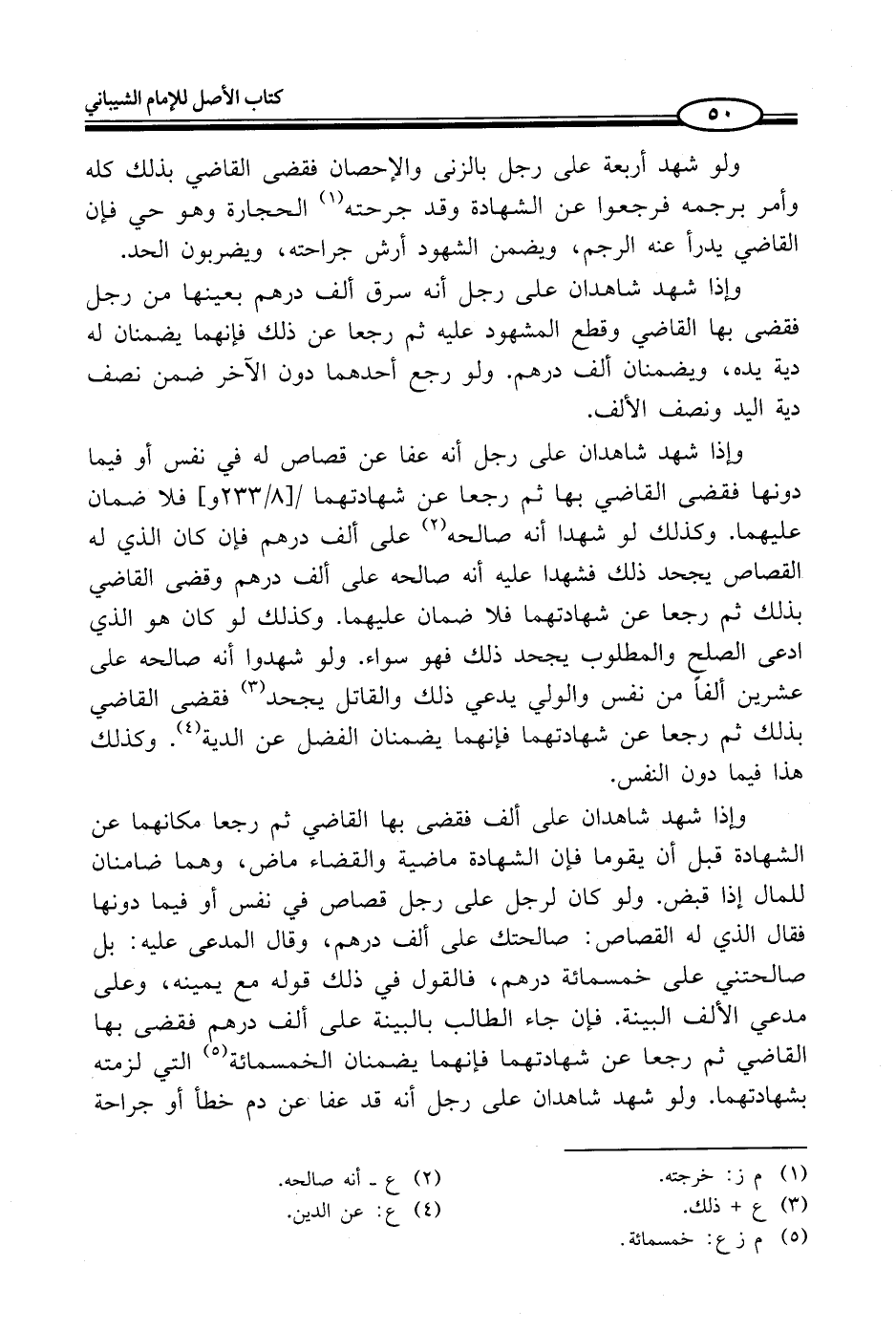وإذا شهد شاهدان على ألف فقضى بها القاضي ثم رجعا مكانهما عن الشهادة قبل أن يقوما فإن الشهادة ماضية والقضاء ماض، وهما ضامنان للمال إذا قبض. ولو كان لرجل على رجل قصاص في نفس أو فيما دونها فقال الذي له القصاص: صالحتك على ألف درهم، وقال المدعى عليه: بل صالحتني على خمسمائة درهم، فالقول في ذلك قوله مع يمينه، وعلى مدعي الألف البينة. فإن جاء الطالب بالبينة على ألف درهم فقضى بها القاضي ثم رجعا عن شهادتهما فإنهما يضمنان الخمسمائة (¬5) الّتي لزمته بشهادتهما. ولو شهد شاهدان على رجل أنه قد عفا عن دم خطأ أو جراحة