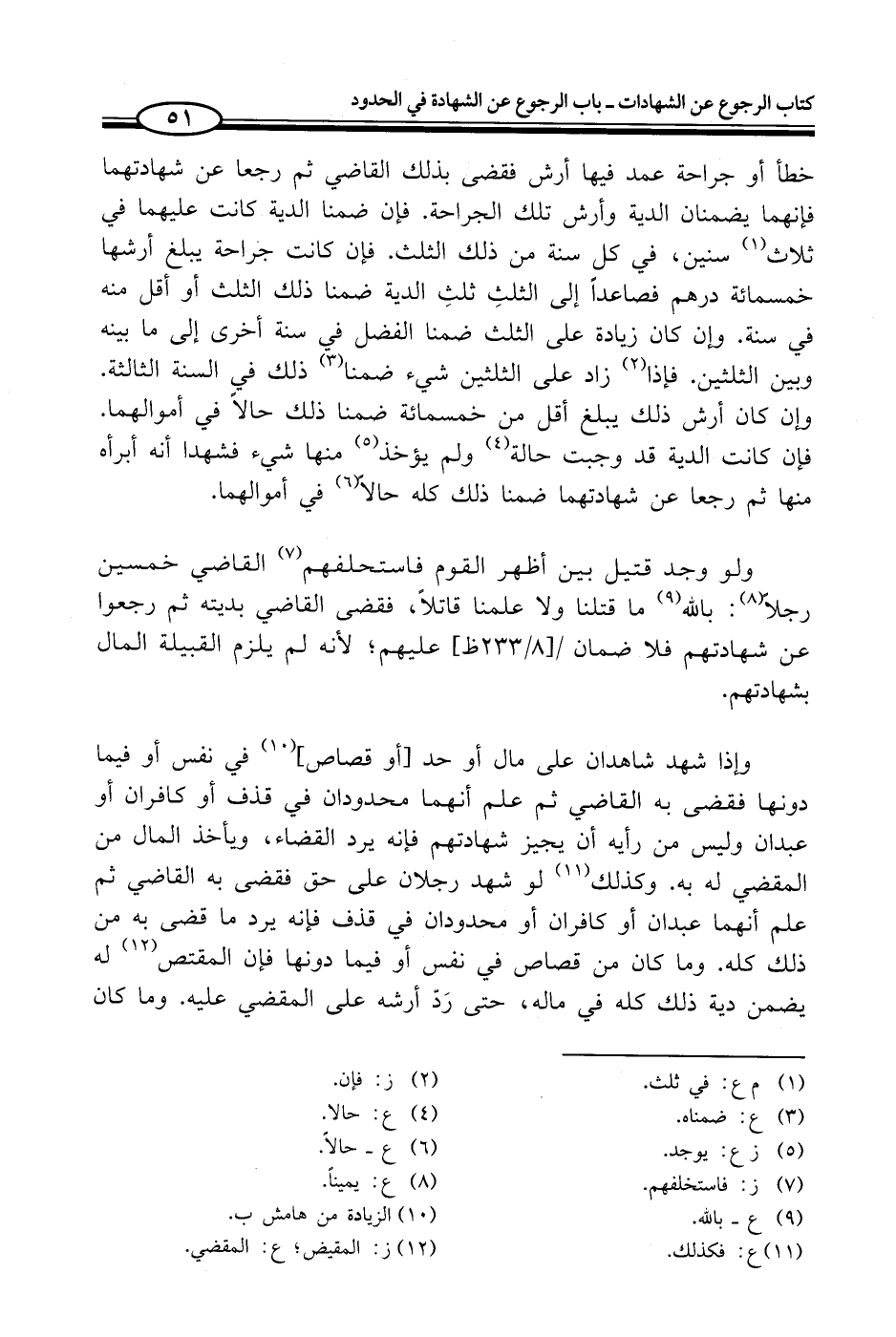 خطأ أو جراحة عمد فيها أرش فقضى بذلك القاضي ثم رجعا عن شهادتهما فإنهما يضمنان الدية وأرش تلك الجراحة. فإن ضمنا الدية كانت عليهما في ثلاث (¬1) سنين، في كل سنة من ذلك الثلث. فإن كانت جراحة يبلغ أرشها خمسمائة درهم فصاعداً إلى الثلثِ ثلثِ الدية ضمنا ذلك الثلث أو أقل منه في سنة. وإن كان زيادة على الثلث ضمنا الفضل في سنة أخرى إلى ما بينه وبين الثلثين. فإذا (¬2) زاد على الثلثين شيء ضمنا (¬3) ذلك في السنة الثّالثة. وإن كان أرش ذلك يبلغ أقل من خمسمائة ضمنا ذلك حالاً في أموالهما. فإن كانت الدية قد وجبت حالة (¬4) ولم يؤخذ (¬5) منها شيء فشهدا أنه أبرأه منها ثم رجعا عن شهادتهما ضمنا ذلك كله حالاً (¬6) في أموالهما.
