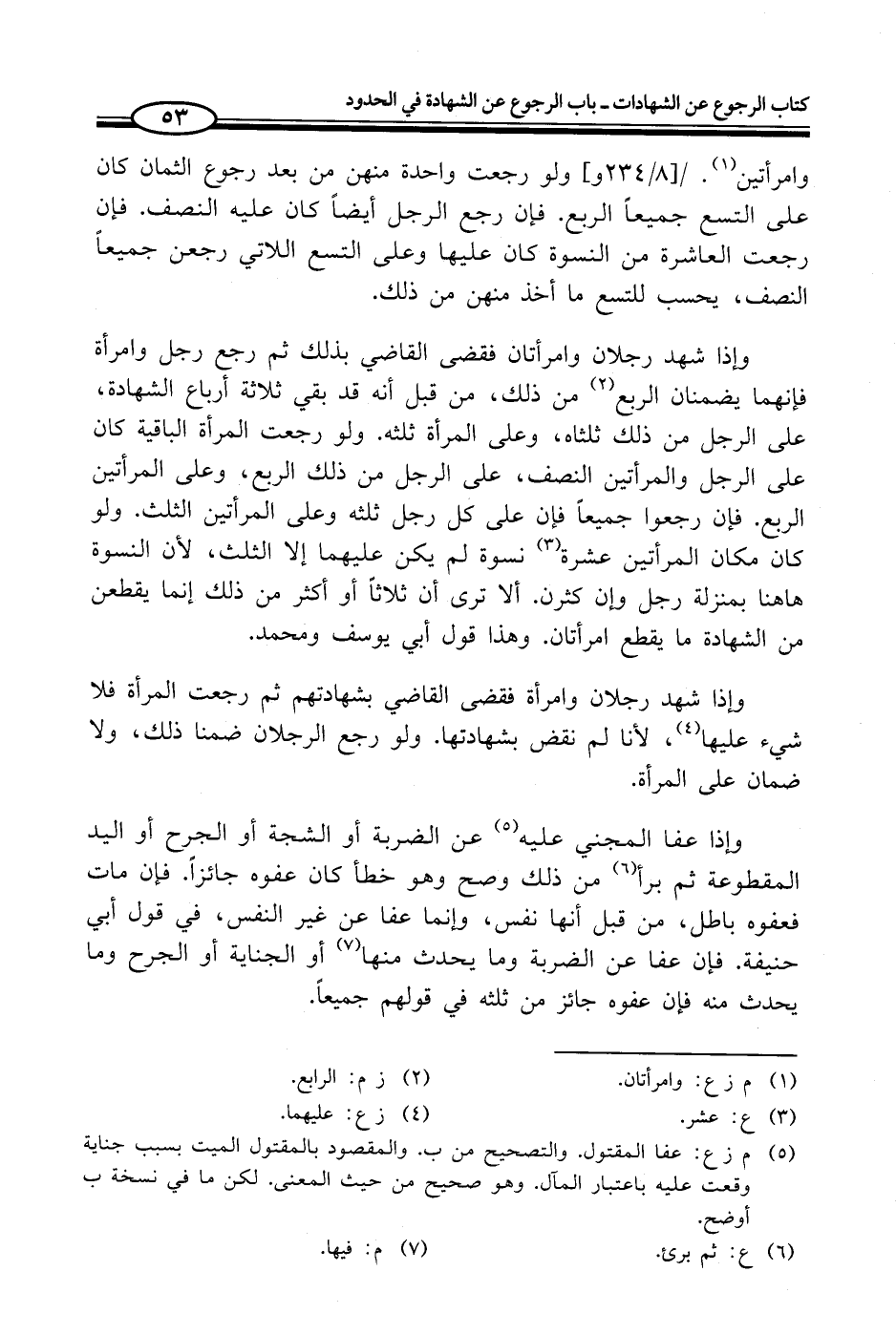 وإذا شهد رجلان وامرأتان فقضى القاضي بذلك ثم رجع رجل وامرأة فإنهما يضمنان الربع (¬2) من ذلك، من قبل أنه قد بقي ثلاثة أرباع الشهادة، على الرجل من ذلك ثلثاه، وعلى المرأة ثلثه. ولو رجعت المرأة الباقية كان على الرجل والمرأتين النصف، على الرجل من ذلك الربع، وعلى المرأتين الربع. فإن رجعوا جميعاً فإن على كل رجل ثلثه وعلى المرأتين الثلث. ولو كان مكان المرأتين عشرة (¬3) نسوة لم يكن عليهما إِلا الثلث، لأن النسوة هاهنا بمنزلة رجل وإن كثرن. ألا ترى أن ثلاثاً أو أكثر من ذلك إنما يقطعن من الشهادة ما يقطع امرأتان. وهذا قول أبي يوسف ومحمد.
