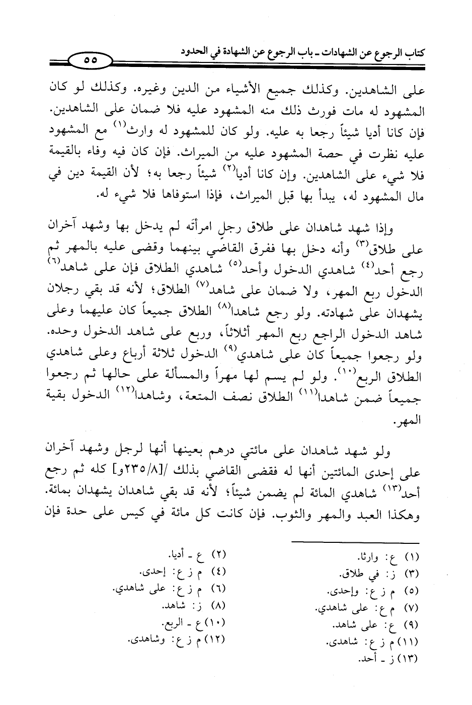على الشاهدين. وكذلك جميع الأشياء من الدين وغيره. وكذلك لو كان المشهود له مات فورث ذلك منه المشهود عليه فلا ضمان على الشاهدين. فإن كانا أديا شيئاً رجعا به عليه. ولو كان للمشهود له وارث (¬1) مع المشهود عليه نظرت في حصة المشهود عليه من الميراث. فإن كان فيه وفاء بالقيمة فلا شيء على الشاهدين. وإن كانا أديا (¬2) شيئاً رجعا به؛ لأن القيمة دين في مال المشهود له، يبدأ بها قبل الميراث، فإذا استوفاها فلا شيء له.