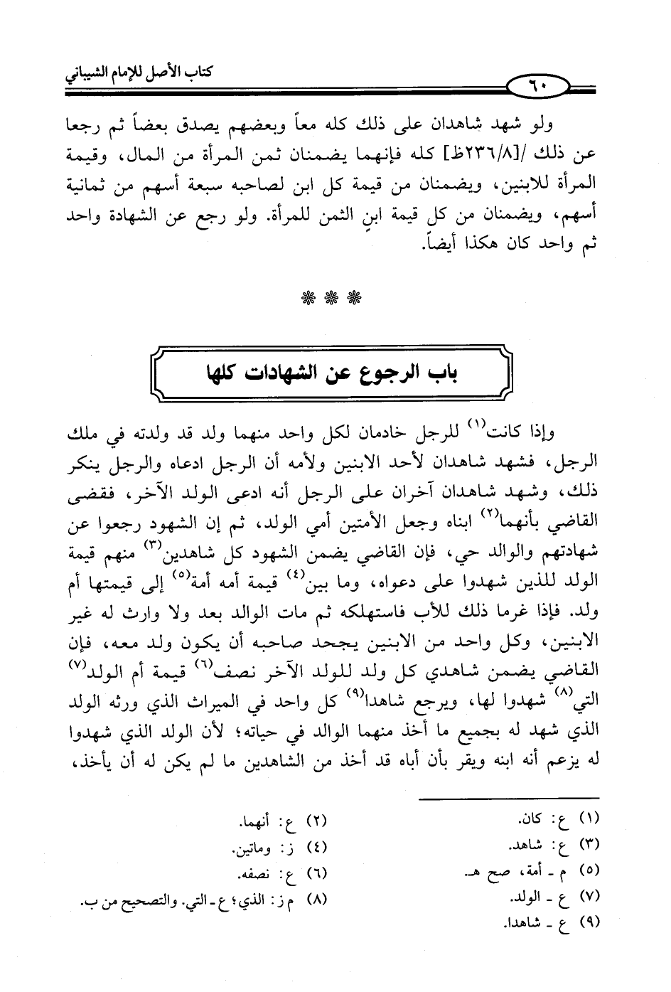 ولو شهد شاهدان على ذلك كله معاً وبعضهم يصدق بعضاً ثم رجعا عن ذلك كله فإنهما يضمنان ثمن المرأة من المال، وقيمة المرأة للابنين، ويضمنان من قيمة كل ابن لصاحبه سبعة أسهم من ثمانية أسهم، ويضمنان من كل قيمة ابنٍ الثمن للمرأة. ولو رجع عن الشهادة واحد ثم واحد كان هكذا أيضاً.