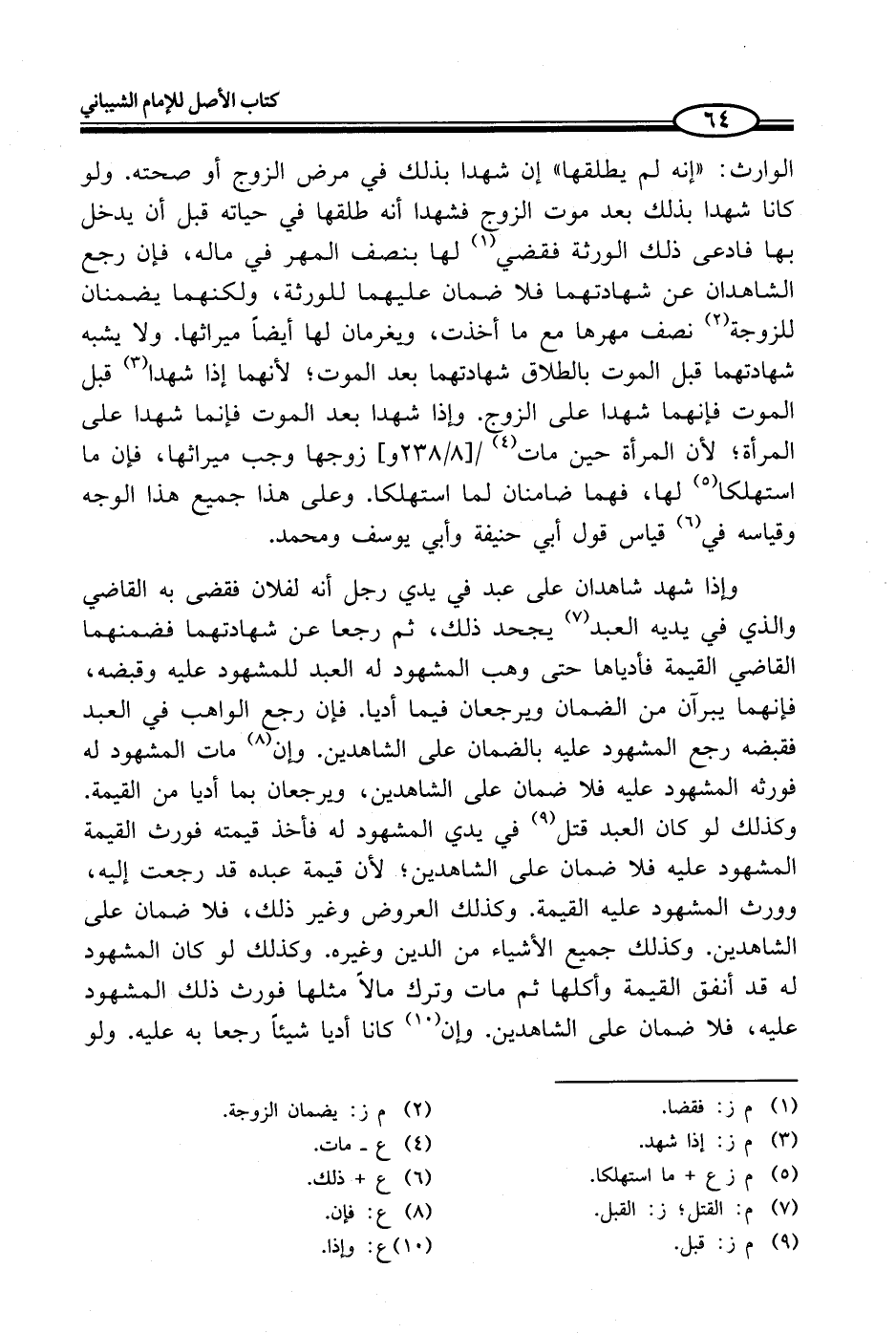 الوارث: "إنّه لم يطلقها" إن شهدا بذلك في مرض الزوج أو صحته. ولو كانا شهدا بذلك بعد موت الزوج فشهدا أنه طلقها في حياته قبل أن يدخل بها فادعى ذلك الورثة فقضي (¬1) لها بنصف المهر في ماله، فإن رجع الشاهدان عن شهادتهما فلا ضمان عليهما للورثة، ولكنهما يضمنان للزوجة (¬2) نصف مهرها مع ما أخذت، ويغرمان لها أيضاً ميراثها. ولا يشبه شهادتهما قبل الموت بالطلاق شهادتهما بعد الموت؛ لأنهما إذا شهدا (¬3) قبل الموت فإنهما شهدا على الزوج. وإذا شهدا بعد الموت فإنما شهدا على المرأة؛ لأن المرأة حين مات (¬4) زوجها وجب ميراثها، فإن ما استهلكا (¬5) لها، فهما ضامنان لما استهلكا. وعلى هذا جميع هذا الوجه وقياسه في (¬6) قياس قول أبي حنيفة وأبي يوسف ومحمد.