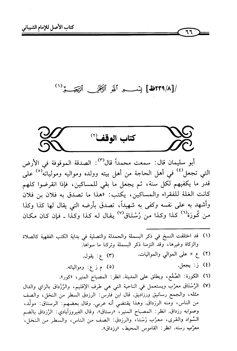 أبو سليمان قال: سمعت محمداً قال (¬3): الصدقة الموقوفة في الأرض التي تجعل (¬4) في أهل الحاجة من أهل بيته وولده ومواليه ومولياته (¬5) على قدر ما يكفيهم لكل سنة، ثم يجعل ما بقي للمساكين، فإذا انقرضوا كلهم كانت الغلة للفقراء والمساكين، يكتب: "هذا ما تصدق به فلان بن فلان وأشهد به على نفسه وكفى به شهيداً، تصدق بأرضه التي يقال لها كذا وكذا من كُورَة (¬6) كذا وكذا من رُسْتَاق (¬7) يقال له كذا وكذا - فإن كان مكان
