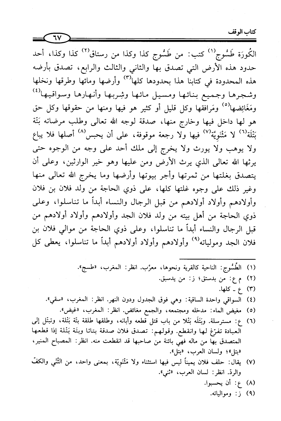 الكُورَة طَسُّوج (¬1) كتب: من طَسَّوج كذا وكذا من رستاق (¬2) كذا وكذا، أحد حدود هذه الأرض التي تصدق بها والثّاني والثّالث والرّابع، تصدق بأرضه هذه المحدودة في كتابنا هذا بحدودها كلها (¬3) وأرضها ومائها وطرقها ونخلها وشجرها وجميع بنائها ومسيل مائها وشِربها وانهارها وسواقيها (¬4) ومَغَائِضها (¬5) ومَرافقها وكل قليل أو كثير هو فيها ومنها من حقوقها وكل حق هو لها داخل فيها وخارج منها، صدقة لوجه الله تعالى وطلب مرضاته بَتّة بَتْلَة (¬6) لا مَثْنَوِيَّة (¬7) فيها ولا رجعة موقوفة، على أن يحبس (¬8) أصلها فلا يباع ولا يوهب ولا يورث ولا يخرج إلى ملك أحد على وجه من الوجوه حتى يرثها الله تعالى الذي يرث الأرض ومن عليها وهو خير الوارثين، وعلى أن يتصدق بغلتها من ثمرتها وأجر بيوتها وأرضها وما يخرج الله تعالى منها وغير ذلك على وجوه غلتها كلها، على ذوي الحاجة من ولد فلان بن فلان وأولادهم وأولاد أولادهم من قبل الرجال والنساء أبداً ما تناسلوا، وعلى ذوي الحاجة من أهل بيته من ولد فلان الجد وأولادهم وأولاد أولادهم من قبل الرجال والنساء أبدأ ما تناسلوا، وعلى ذوي الحاجة من موالي فلان بن فلان الجد ومولياته (¬9) وأولادهم وأولاد أولادهم أبدأ ما تناسلوا، يعطى كل