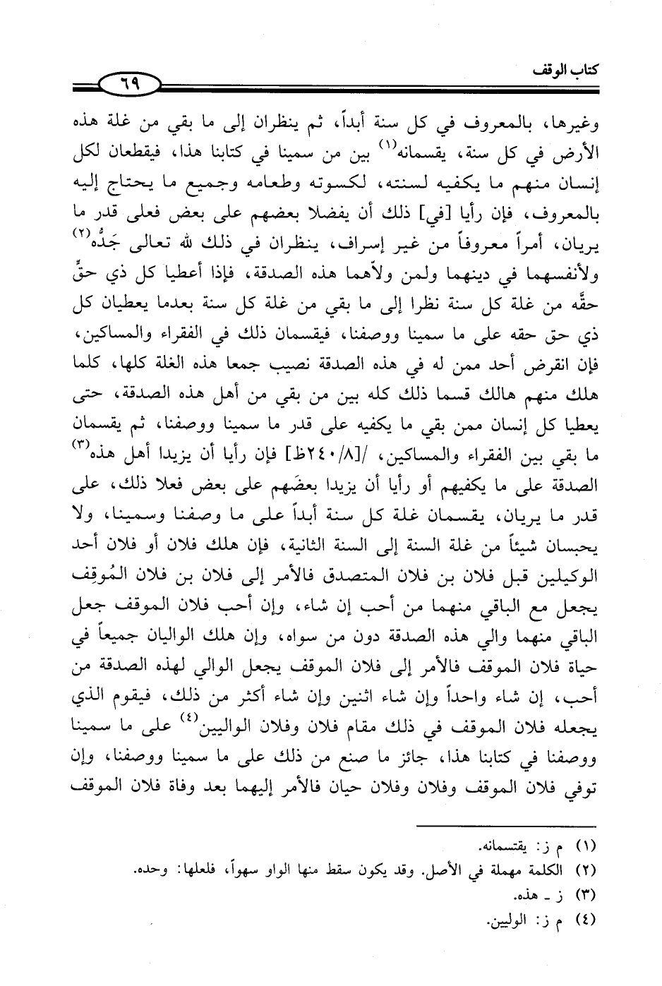 وغيرها، بالمعروف في كل سنة أبداً، ثم ينظران إلى ما بقي من غلة هذه الأرض في كل سنة، يقسمانه (¬1) بين من سمينا في كتابنا هذا، فيقطعان لكل إنسان منهم ما يكفيه لسنته، لكسوته وطعامه وجميع ما يحتاج إليه بالمعروف، فإن رأيا أفي، ذلك أن يفضلا بعضهم على بعض فعلى قدر ما يريان، أمرأ معروفاً من غير إسراف، ينظران في ذلك لله تعالى جَدُّه (¬2) ولأنفسهما في دينهما ولمن ولاّهما هذه الصدقة، فإذا أعطيا كل ذي حقٍّ حقه من غلة كل سنة نظرا إلى ما بقي من غلة كل سنة بعدما يعطيان كل ذي حق حقه على ما سمينا ووصفنا، فيقسمان ذلك في الفقراء والمساكين، فإن انقرض أحد ممّن له في هذه الصدقة نصيب جمعا هذه الغلة كلها، كلما هلك منهم هالك قسما ذلك كله بين من بقي من أهل هذه الصدقة، حتى يعطيا كل إنسان ممّن بقي ما يكفيه على قدر ما سمينا ووصفنا، ثم يقسمان ما بقي بين الفقراء والمساكين، فإن رأيا أن يزيدا أهل هذه (¬3) الصدقة على ما يكفيهم أو رأيا أن يزيدا بعضَهم على بعض فعلا ذلك، على قدر ما يريان، يقسمان غلة كل سنة أبداً على ما وصفنا وسمينا، ولا يحبسان شيئاً من غلة السنة إلى السنة الثّانية، فإن هلك فلان أو فلان أحد الوكيلين قبل فلان بن فلان المتصدق فالأمر إلى فلان بن فلان المُوقِف يجعل مع الباقي منهما من أحب إن شاء، وإن أحب فلان الموقف جعل الباقي منهما والي هذه الصدقة دون من سواه، وإن هلك الواليان جميعاً في حياة فلان الموقف فالأمر إلى فلان الموقف يجعل الوالي لهذه الصدقة من أحب، إن شاء واحداً وإن شاء اثنين وإن شاء أكثر من ذلك، فيقوم الذي يجعله فلان الموقف في ذلك مقام فلان وفلان الواليين (¬4) على ما سمينا ووصفنا في كتابنا هذا، جائز ما صنع من ذلك على ما سمينا ووصفنا، وإن توفي فلان الموقف وفلان وفلان حيان فالأمر إليهما بعد وفاة فلان الموقف