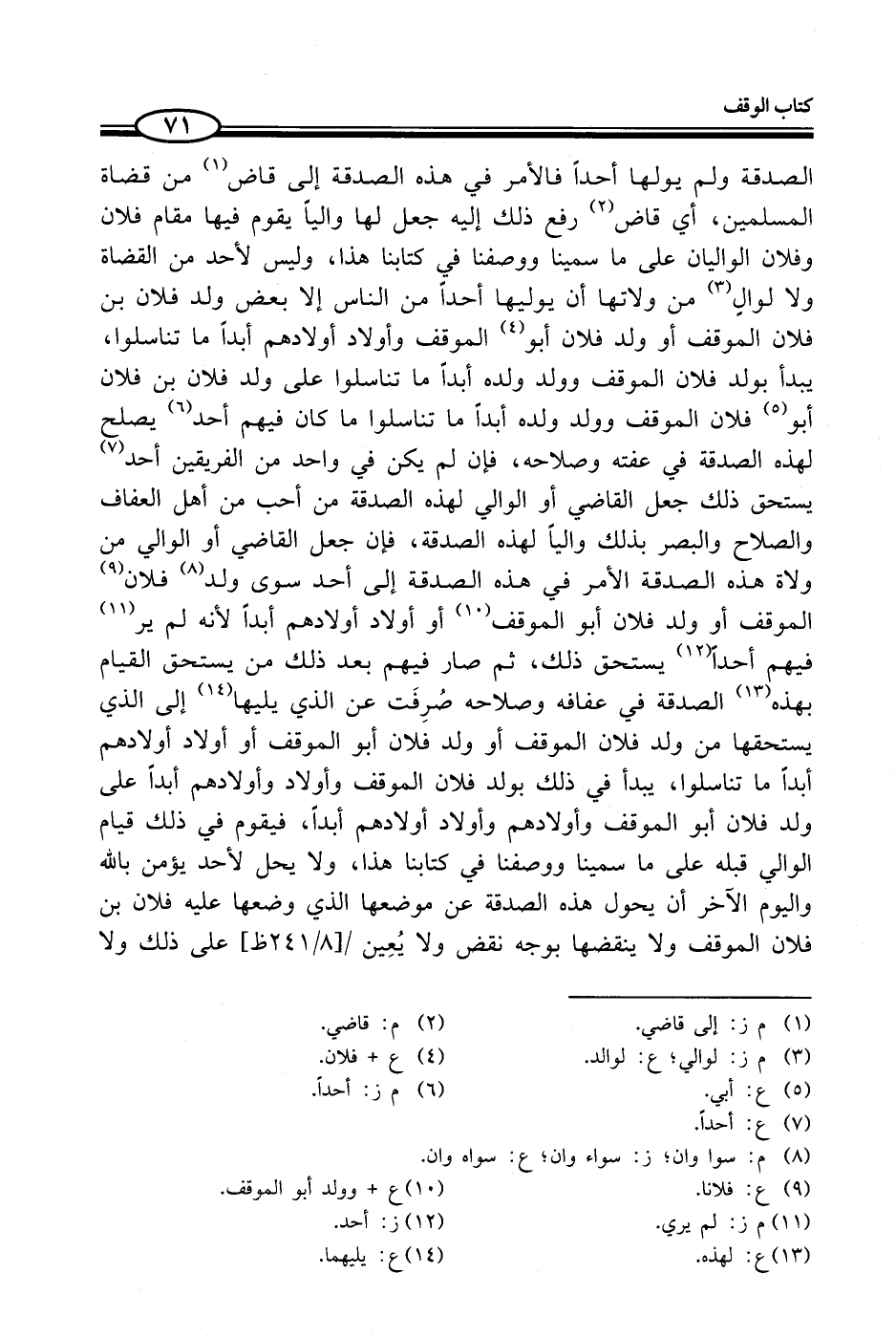 الصدقة ولم يولها أحداً فالأمر في هذه الصدقة إلى قاض (¬1) من قضاة المسلمين، أي قاض (¬2) رفع ذلك إليه جعل لها واليًا يقوم فيها مقام فلان وفلان الواليان على ما سمينا ووصفنا في كتابنا هذا، وليس لأحد من القضاة ولا لوالي (¬3) من ولاتها أن يوليها أحداً من النَّاس إِلا بعض ولد فلان بن فلان الموقف أو ولد فلان أبو (¬4) الموقف وأولاد أولادهم أبداً ما تناسلوا، يبدأ بولد فلان الموقف وولد ولده أبداً ما تناسلوا على ولد فلان بن فلان أبو (¬5) فلان الموقف وولد ولده أبدأ ما تناسلوا ما كان فيهم أحد (¬6) يصلح لهذه الصدقة في عفته وصلاحه، فإن لم يكن في واحد من الفريقين أحد (¬7) يستحق ذلك جعل القاضي أو الوالي لهذه الصدقة من أحب من أهل العفاف والصلاح والبصر بذلك واليأ لهذه الصدقة، فإن جعل القاضي أو الوالي من ولاة هذه الصدقة الأمر في هذه الصدقة إلى أحد سوى ولد (¬8) فلان (¬9) الموقف أو ولد فلان أبو الموقف (¬10) أو أولاد أولادهم أبدأ لأنه لم ير (¬11) فيهم أحدأ (¬12) يستحق ذلك، ثم صار فيهم بعد ذلك من يستحق القيام بهذه (¬13) الصدقة في عفافه وصلاحه صُرِفَت عن الذي يليها (¬14) إلى الذي يستحقها من ولد فلان الموقف أو ولد فلان أبو الموقف أو أولاد أولادهم أبدأ ما تناسلوا، يبدأ في ذلك بولد فلان الموقف وأولاد وأولادهم أبداً على ولد فلان أبو الموقف وأولادهم وأولاد أولادهم أبدأ، فيقوم في ذلك قيام الوالي قبله على ما سمينا ووصفنا في كتابنا هذا، ولا يحل لأحد يؤمن بالله واليوم الآخر أن يحول هذه الصدقة عن موضعها الذي وضعها عليه فلان بن فلان الموقف ولا ينقضها بوجه نقض ولا يُعِين على ذلك ولا