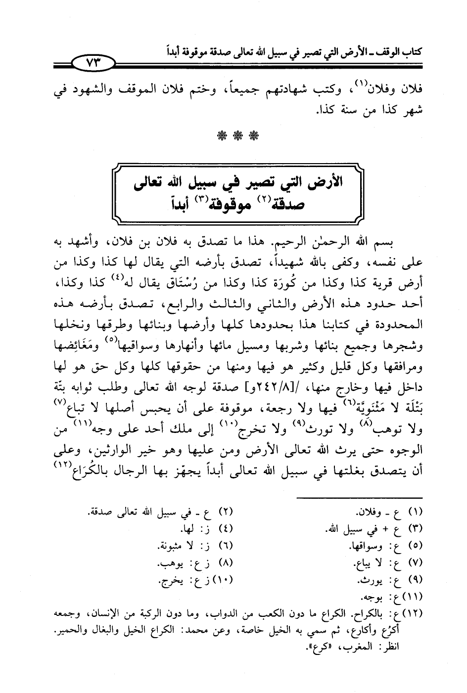 بسم الله الرّحمن الرحيم. هذا ما تصدق به فلان بن فلان، وأشهد به على نفسه، وكفى بالله شهيداً، تصدق بأرضه التي يقال لها كذا وكذا من أرض قرية كذا وكذا من كُورَة كذا وكذا من رُسْتَاق يقال له (¬4) كذا وكذا، أحد حدود هذه الأرض والثّاني والثّالث والرّابع، تصدق بأرضه هذه المحدودة في كتابنا هذا بحدودها كلها وأرضها وبنائها وطرقها ونخلها وشجرها وجميع بنائها وشربها ومسيل مائها وانهارها وسواقيها (¬5) ومَغَائِضها ومرافقها وكل قليل وكثير هو فيها ومنها من حقوقها كلها وكل حق هو لها داخل فيها وخارج منها، صدقة لوجه الله تعالى وطلب ثوابه بتة بَتْلَة لا مَثْنَويَّة (¬6) فيها ولا رجعة، موقوفة على أن يحبس أصلها لا تباع (¬7) ولا توهب (¬8) ولا تورث (¬9) ولا تخرج (¬10) إلى ملك أحد على وجه (¬11) من الوجوه حتى يرث الله تعالى الأرض ومن عليها وهو خير الوارثين، وعلى أن يتصدق بغلتها في سبيل الله تعالى أبداً يجهّز بها الرجال بالكُرَاع (¬12)