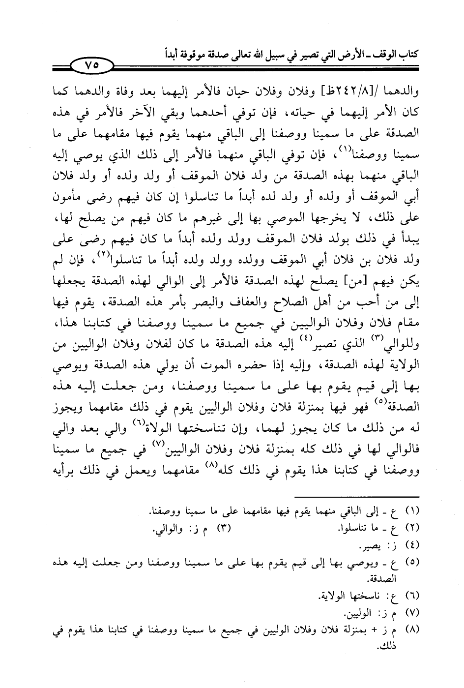 والدهما وفلان وفلان حيان فالأمر إليهما بعد وفاة والدهما كما كان الأمر إليهما في حياته، فإن توفي أحدهما وبقي الآخر فالأمر في هذه الصدقة على ما سمينا ووصفنا إلى الباقي منهما يقوم فيها مقامهما على ما سمينا ووصفنا (¬1)، فإن توفي الباقي منهما فالأمر إلى ذلك الذي يوصي إليه الباقي منهما بهذه الصدقة من ولد فلان الموقف أو ولد ولده أو ولد فلان أبي الموقف أو ولده أو ولد لده أبداً ما تناسلوا إن كان فيهم رضى مأمون على ذلك، لا يخرجها الموصي بها إلى غيرهم ما كان فيهم من يصلح لها، يبدأ في ذلك بولد فلان الموقف وولد ولده أبداً ما كان فيهم رضى على ولد فلان بن فلان أبي الموقف وولده وولد ولده أبداً ما تناسلوا (¬2)، فإن لم يكن فيهم أمن، يصلح لهذه الصدقة فالأمر إلى الوالي لهذه الصدقة يجعلها إلى من أحب من أهل الصلاح والعفاف والبصر بأمر هذه الصدقة، يقوم فيها مقام فلان وفلان الواليين في جميع ما سمينا ووصفنا في كتابنا هذا، وللوالي (¬3) الذي تفسير (¬4) إليه هذه الصدقة ما كان لفلان وفلان الواليين من الولاية لهذه الصدقة، وإليه إذا حضره الموت أن يولي هذه الصدقة ويوصي بها إلى قيم يقوم بها على ما سمينا ووصفنا، ومن جعلت إليه هذه الصدقة (¬5) فهو فيها بمنزلة فلان وفلان الواليين يقوم في ذلك مقامهما ويجوز له من ذلك ما كان يجوز لهما، وإن تناسختها الولاة (¬6) والي بعد والي فالوالي لها في ذلك كله بمنزلة فلان وفلان الواليين (¬7) في جميع ما سمينا ووصفنا في كتابنا هذا يقوم في ذلك كله (¬8) مقامهما ويعمل في ذلك برأيه