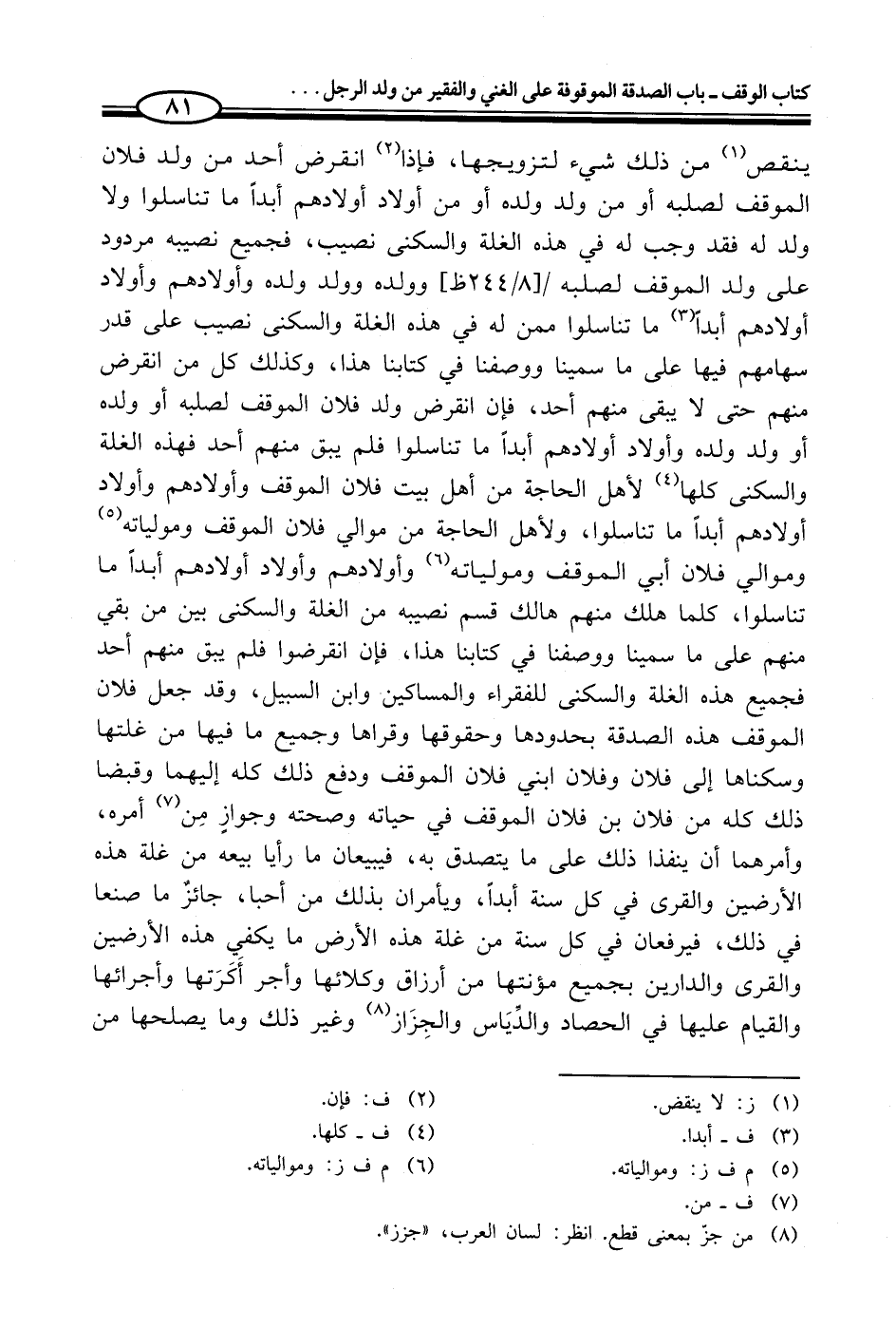 ينقص (¬1) من ذلك شيء لتزويجها، فإذا (¬2) انقرض أحد من ولد فلان الموقف لصلبه أو من ولد ولده أو من أولاد أولادهم أبداً ما تناسلوا ولا ولد له فقد وجب له في هذه الغلة والسكنى نصيب، فجميع نصيبه مردود على ولد الموقف لصلبه وولده وولد ولده وأولادهم وأولاد أولادهم أبداً (¬3) ما تناسلوا ممّن له في هذه الغلة والسكنى نصيب على قدر سهامهم فيها على ما سمينا ووصفنا في كتابنا هذا، وكذلك كل من انقرض منهم حتى لا يبقى منهم أحد، فإن انقرض ولد فلان الموقف لصلبه أو ولده أو ولد ولده وأولاد أولادهم أبداً ما تناسلوا فلم يبق منهم أحد فهذه الغلة والسكنى كلها (¬4) لأهل الحاجة من أهل بيت فلان الموقف وأولادهم وأولاد أولادهم أبداً ما تناسلوا، ولأهل الحاجة من موالي فلان الموقف ومولياته (¬5) وموالي فلان أبي الموقف ومولياته (¬6) وأولادهم وأولاد أولادهم أبداً ما تناسلوا، كلما هلك منهم هالك قسم نصيبه من الغلة والسكنى بين من بقي منهم على ما سمينا ووصفنا في كتابنا هذا، فإن انقرضوا فلم يبق منهم أحد فجميع هذه الغلة والسكنى للفقراء والمساكين وابن السبيل، وقد جعل فلان الموقف هذه الصدقة بحدودها وحقوقها وقراها وجميع ما فيها من غلتها وسكناها إلى فلان وفلان ابني فلان الموقف ودفع ذلك كله إليهما وقبضا ذلك كله من فلان بن فلان الموقف في حياته وصحته وجوازٍ مِن (¬7) أمره، وأمرهما أن ينفذا ذلك على ما يتصدق به، فيبيعان ما رأيا بيعه من غلة هذه الأرضين والقرى في كل سنة أبداً، ويأمران بذلك من أحبا، جائزٌ ما صنعا في ذلك، فيرفعان في كل سنة من غلة هذه الأرض ما يكفي هذه الأرضين والقرى والدارين بجميع مؤنتها من أرزاق وكلائها وأجر أَكَرَتها وأجرائها والقيام عليها في الحصاد والدِّيَاس والجِزَاز (¬8) وغير ذلك وما يصلحها من