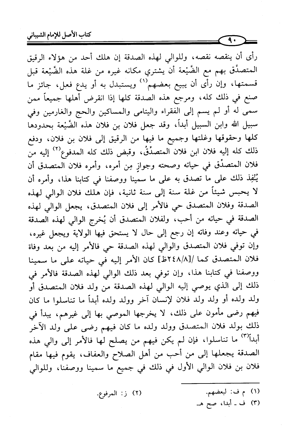 رأى أن ينقصه نقصه، وللوالي لهذه الصدقة إن هلك أحد من هؤلاء الرّقيق المتصدَّق بهم مع الضَّيْعة أن يشتري مكانه غيره من غلة هذه الضَّيْعة قبل قسمتها، وإن رأى أن يبيع بعضهم (¬1) ويستبدل به أو يدع فبل، جائز ما صنع في ذلك كله، ومرجع هذه الصدقة كلها إذا انقرض أهلها جميعاً ممّن سمى له أو لم يسم إلى الفقراء واليتامى والمساكين والحج والغارمين وفي سبيل الله وابن السبيل أبداً، وقد جعل فلان بن فلان هذه الضَّيْعة بحدودها كلها وحقوقها وغلتها وجميع ما فيها من الرّقيق إلى فلان بن فلان، ودفع ذلك كله إليه فلان ابن فلان المتصدِّقُ، وقبض ذلك كله المدفوع (¬2) إليه من فلان المتصدق في حياته وصحته وجوازٍ مِن أمره، وأمره فلان المتصدق أن يُنْفِذ ذلك على ما تصدق به على ما سمينا ووصفنا في كتابنا هذا، وأمره أن لا يحبس شيئاً من غلة سنة إلى سنة ثانية، فإن هلك فلان الوالي لهذه الصدقة وفلان المتصدق حي فالأمر إلى فلان المتصدق، يجعل الوالي لهذه الصدقة في حياته من أحب، ولفلان المتصدق أن يُخرج الوالي لهذه الصدقة في حياته وعند وفاته إن رجع إلى حال لا يستحق فيها الولاية ويجعل غيره، وإن توفي فلان المتصدق والوالي لهذه الصدقة حي فالأمر إليه من بعد وفاة فلان المتصدق كما كان الأمر إليه في حياته على ما سمينا ووصفنا في كتابنا هذا، وإن توفي بعد ذلك الوالي لهذه الصدقة فالأمر في ذلك إلى الذي يوصي إليه الوالي لهذه الصدقة من ولد فلان المتصدق أو ولد ولده أو ولد ولد فلان لإنسان آخر وولد ولده أبداً ما تناسلوا ما كان فيهم رضى مأمون على ذلك، لا يخرجها الموصي بها إلى غيرهم، يبدأ في ذلك بولد فلاق المتصدق وولد ولده ما كان فيهم رضى على ولد الآخر أبداً (¬3) ما تناسلوا، فإن لم يكن فيهم من يصلح لها فالأمر إلى والي هذه الصدقة يجعلها إلى من أحب من أهل الصلاح والعفاف، يقوم فيها مقام فلان بن فلان الوالي الأول في ذلك في جميع ما سمينا ووصفنا، وللوالي