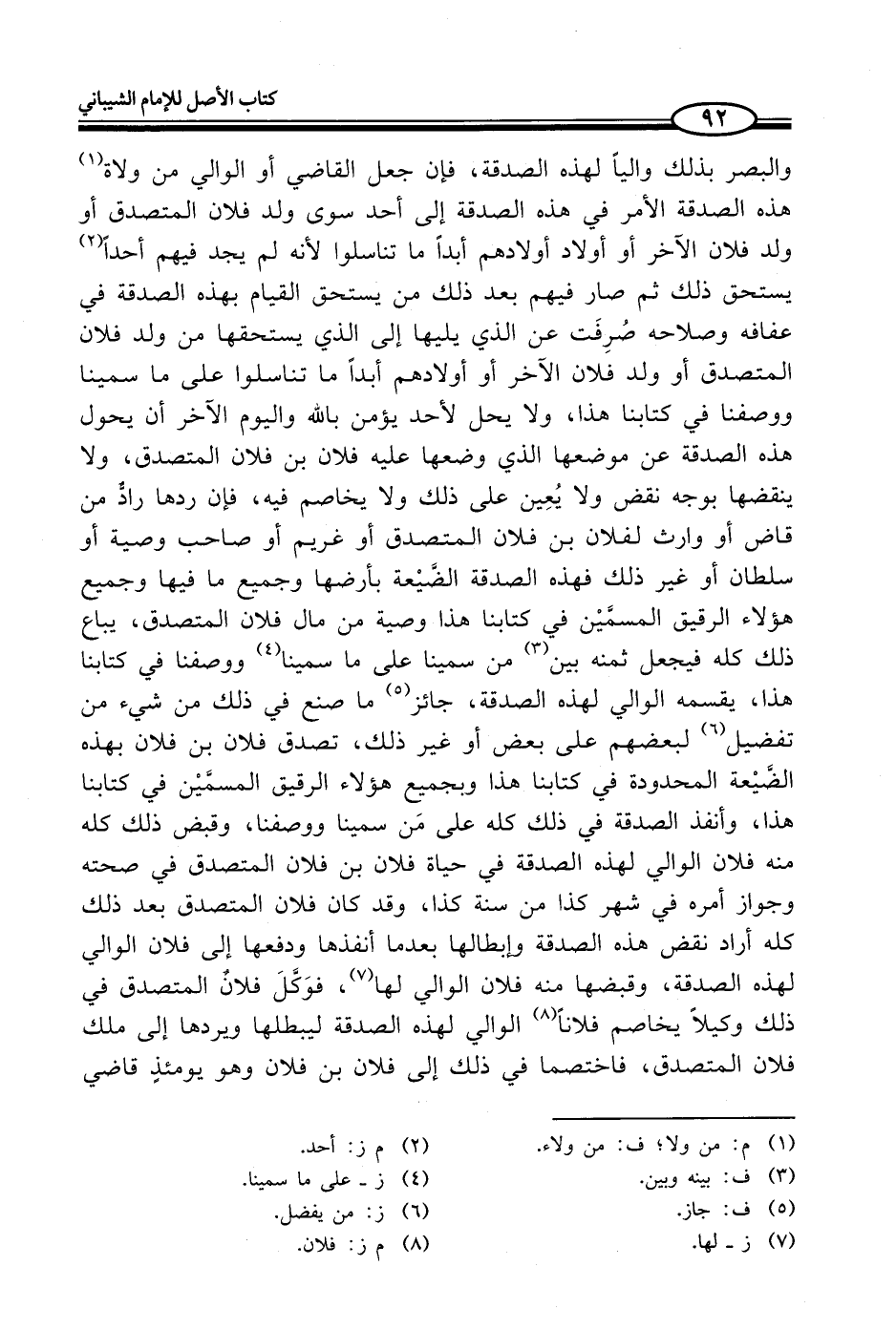 والبصر بذلك والياً لهذه الصدقة، فإن جعل القاضي أو الوالي من ولاة (¬1) هذه الصدقة الأمر في هذه الصدقة إلى أحد سوى ولد فلان المتصدق أو ولد فلان الآخر أو أولاد أولادهم أبداً ما تناسلوا لأنه لم يجد فيهم أحداً (¬2) يستحق ذلك ثم صار فيهم بعد ذلك من يستحق القيام بهذه الصدقة في عفافه وصلاحه صُرِفَت عن الذي يليها إلى الذي يستحقها من ولد فلان المتصدق أو ولد فلان الآخر أو أولادهم أبداً ما تناسلوا على ما سمينا ووصفنا في كتابنا هذا، ولا يحل لأحد يؤمن بالله واليوم الآخر أن يحول هذه الصدقة عن موضعها الذي وضعها عليه فلان بن فلان المتصدق، ولا ينقضها بوجه نقض ولا يُعِين على ذلك ولا يخاصم فيه، فإن ردها رادٌّ من قاض أو وارث لفلان بن فلان المتصدق أو غريم أو صاحب وصية أو سلطان أو غير ذلك فهذه الصدقة الضَّيْعة بأرضها وجميع ما فيها وجميع هؤلاء الرّقيق المسمَّيْن في كتابنا هذا وصية من مال فلان المتصدق، يباع ذلك كله فيجعل ثمنه بين (¬3) من سمينا على ما سمينا (¬4) ووصفنا في كتابنا هذا، يقسمه الوالي لهذه الصدقة، جائز (¬5) ما صنع في ذلك من شيء من تفضيل (¬6) لبعضهم على بعض أو غير ذلك، تصدق فلان بن فلان بهذه الضَّيْعة المحدودة في كتابنا هذا وبجميع هؤلاء الرّقيق المسمَّيْن في كتابنا هذا، وأنفذ الصدقة في ذلك كله على مَنْ سمينا ووصفنا، وقبض ذلك كله منه فلان الوالي لهذه الصدقة في حياة فلان بن فلان المتصدق في صحته وجواز أمره في شهر كذا من سنة كذا، وقد كان فلان المتصدق بعد ذلك كله أراد نقض هذه الصدقة وإبطالها بعدما أنفذها ودفعها إلى فلان الوالي لهذه الصدقة، وقبضها منه فلان الوالي لها (¬7)، فوَكَّلَ فلان المتصدق في ذلك وكيلاً يخاصم فلاناً (¬8) الوالي لهذه الصدقة ليبطلها ويردها إلى ملك فلان المتصدق، فاختصما في ذلك إلى فلان بن فلان وهو يومئذٍ قاضي
