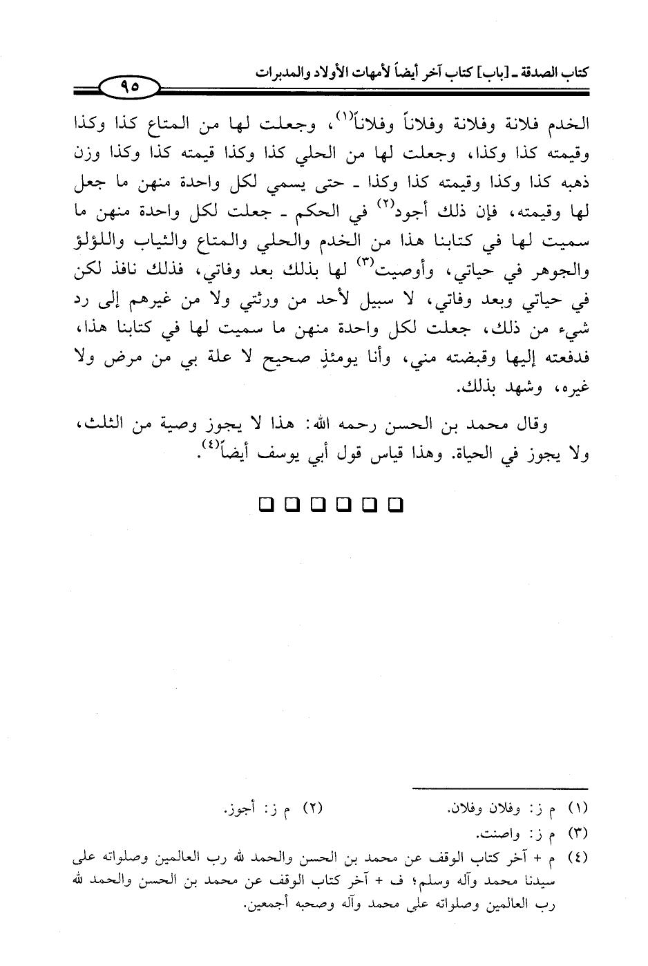(¬4) م - آخر كتاب الوقف عق محمد بن الحسن والحمد لله رب العالمين وصلواته على سيدنا محمد وآله وسلم؛ ف + آخر كتاب الوقف عن محمد بن الحسن والحمد لله رب العالمين وصلواته محلى محمد وآله وصحبه أجمعين.