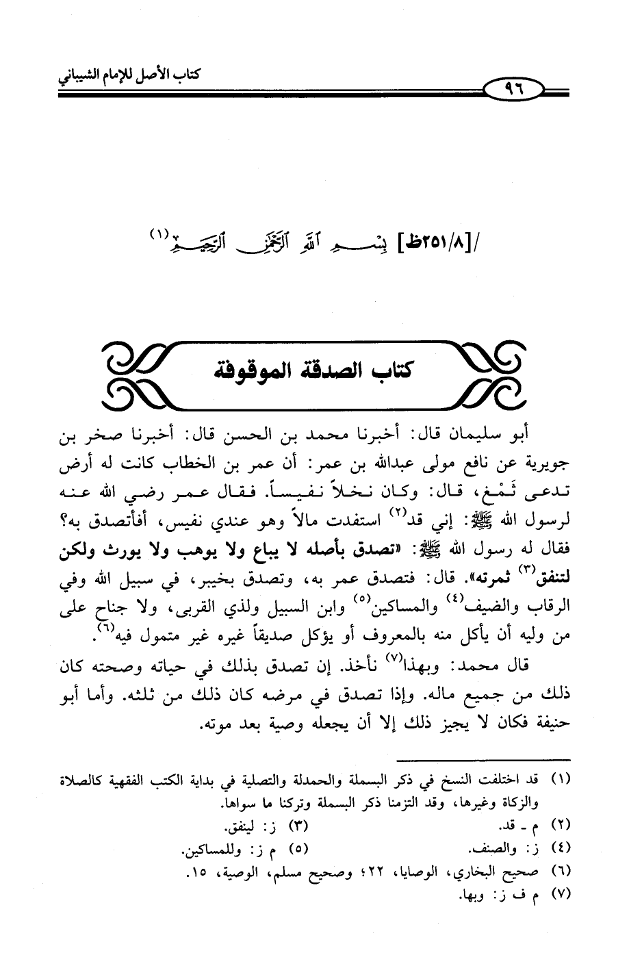 أبو سليمان قال: أخبرنا محمد بن الحسن قال: أخبرنا صخر بن جويرية عن نافع مولى عبد الله بن عمر: أن عمر بن الخطاب كانت له أرض تدعى ثَمْغ، قال: وكان نخلاً نفيساً. فقال عمر - رضي الله عنه - لرسول الله جميه!: إنِّي قد (¬2) استفدت مالاً وهو عندي نفيس، أفأتصدق به؟ فقال له رسول الله - صلى الله عليه وسلم -: "تصدق بأصله لا يباع ولا يوهب ولا يورث ولكن لتنفق (¬3) ثمرته". قال: فتصدق عمر به، وتصدق بخيبر، في سبيل الله وفي الرقاب والضيف (¬4) والمساكين (¬5) وابن السبيل ولذي القربى، ولا جناح على من وليه أن يأكل منه بالمعروف أو يؤكل صديقاً غيره غير متمول فيه (¬6).