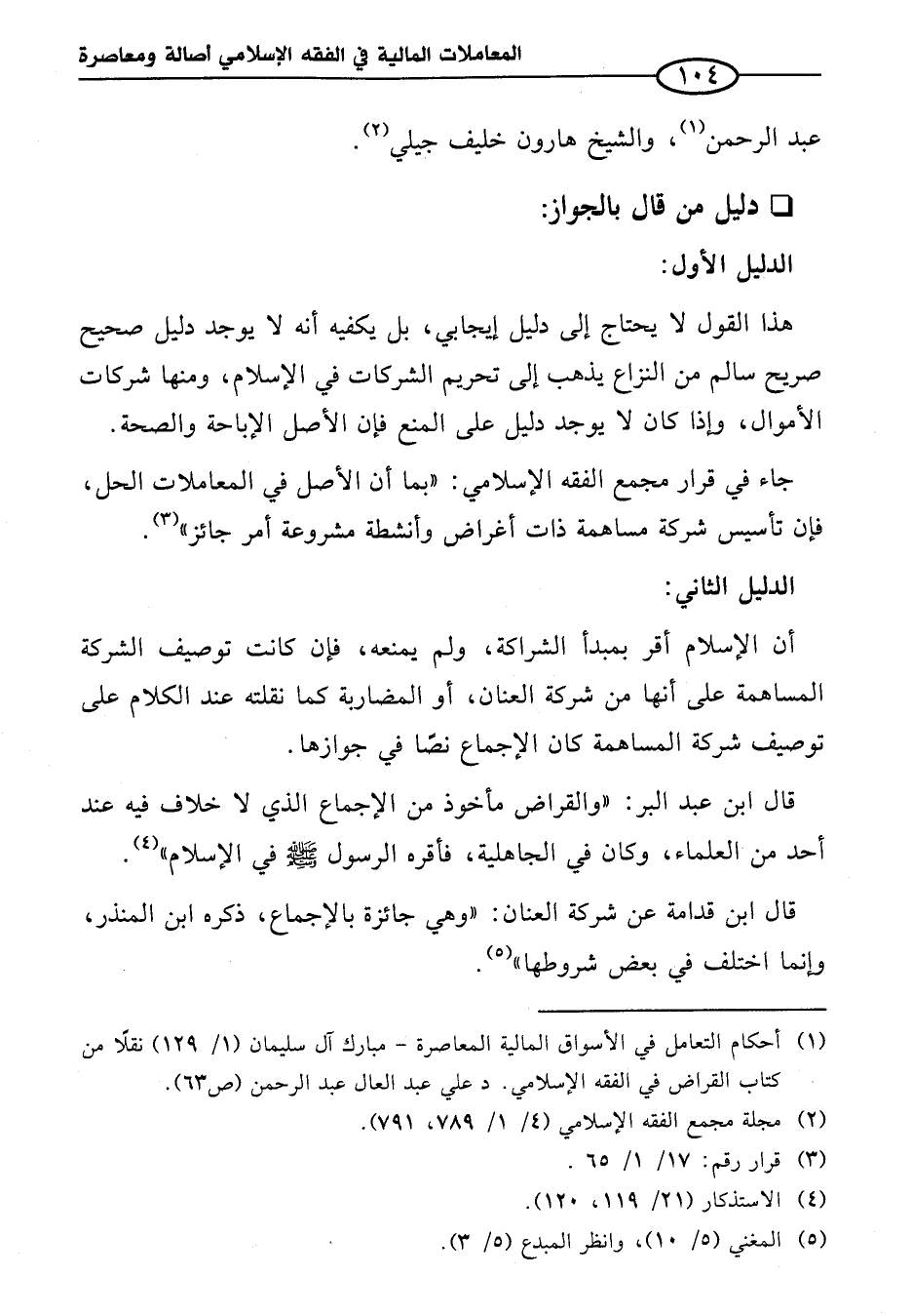 (¬١) أحكام التعامل في الأسواق المالية المعاصرة - مبارك آل سليمان (١/ ١٢٩) نقلًا من كتاب القراض في الفقه الإِسلامي. د. علي عبد العال عبد الرحمن (ص ٦٣).