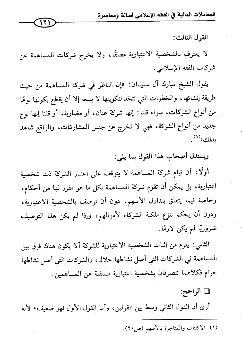 لا يعترف بالشخصية الاعتبارية مطلقًا, ولا يخرج شركات المساهمة عن شركات الفقه الإِسلامي.