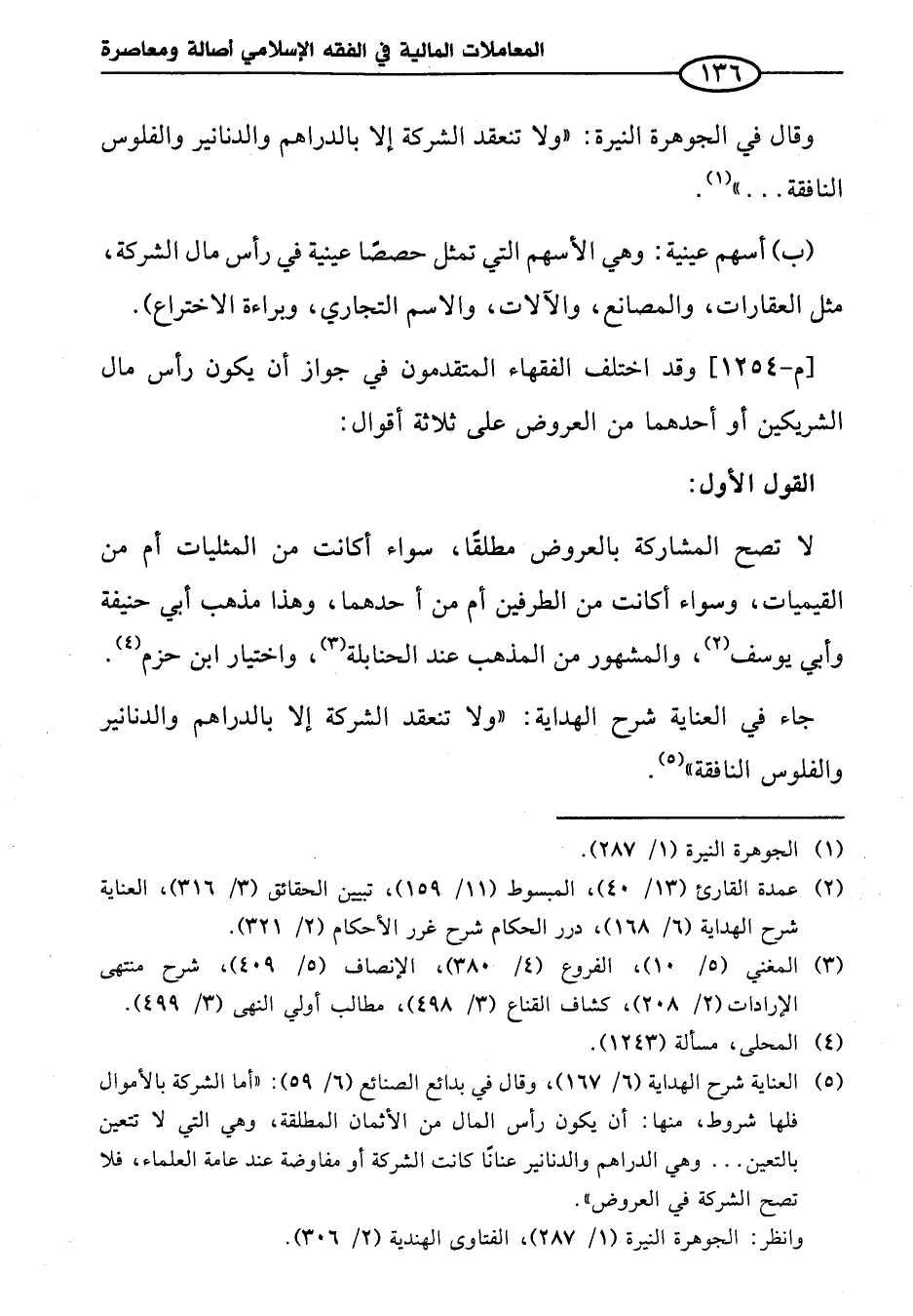 (¬٥) العناية شرح الهداية (٦/ ١٦٧)، وقال في بدائع الصنائع (٦/ ٥٩): "أما الشركة بالأموال فلها شروط، منها: أن يكون رأس المال من الأثمان المطلقة، وهي التي لا تتعين بالتعين ... وهي الدراهم والدنانير عنانًا كانت الشركة أو مفاوضة عند عامة العلماء، فلا تصح الشركة في العروض".