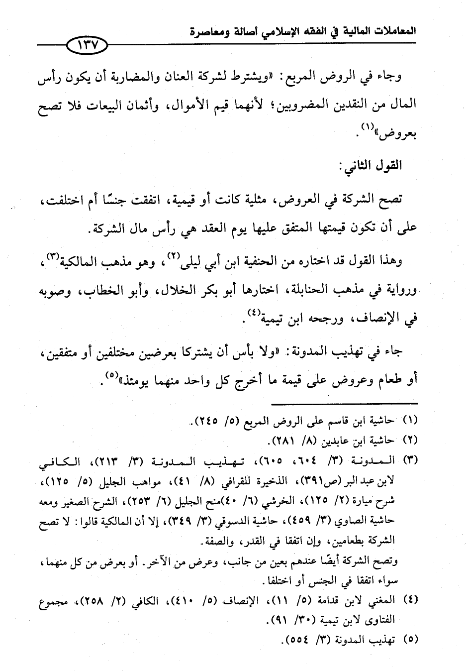تصح الشركة في العروض، مثلية كانت أو قيمية، اتفقت جنسًا أم اختلفت، على أن تكون قيمتها المتفق عليها يوم العقد هي رأس مال الشركة.