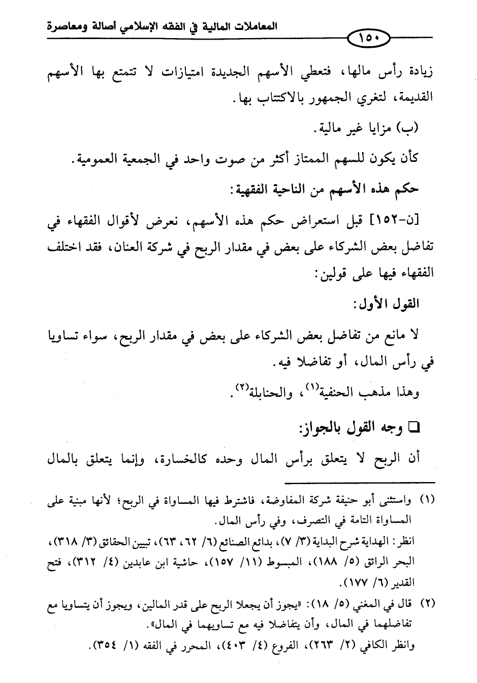 [ن -١٥٢] قبل استعراض حكم هذه الأسهم، نعرض لأقوال الفقهاء في تفاضل بعض الشركاء على بعض في مقدار الربح في شركة العنان، فقد اختلف الفقهاء فيها على قولين: