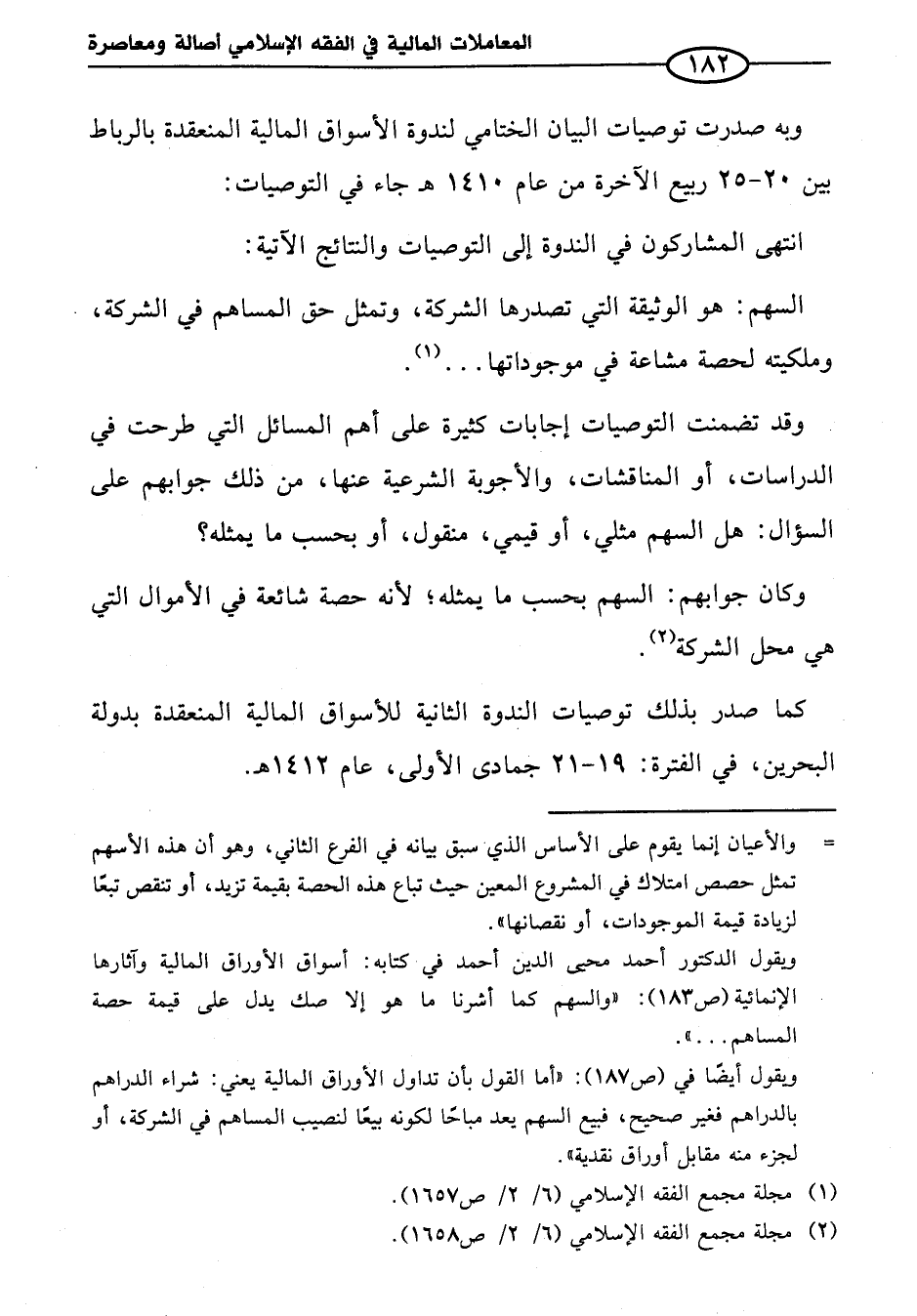 ويقول أيضًا في (ص ١٨٧): "أما القول بأن تداول الأوراق المالية يعني: شراء الدراهم بالدراهم فغير صحيح، فبيع السهم يعد مباحًا لكونه بيعًا لنصيب المساهم في الشركة، أو لجزء منه مقابل أوراق نقدية".