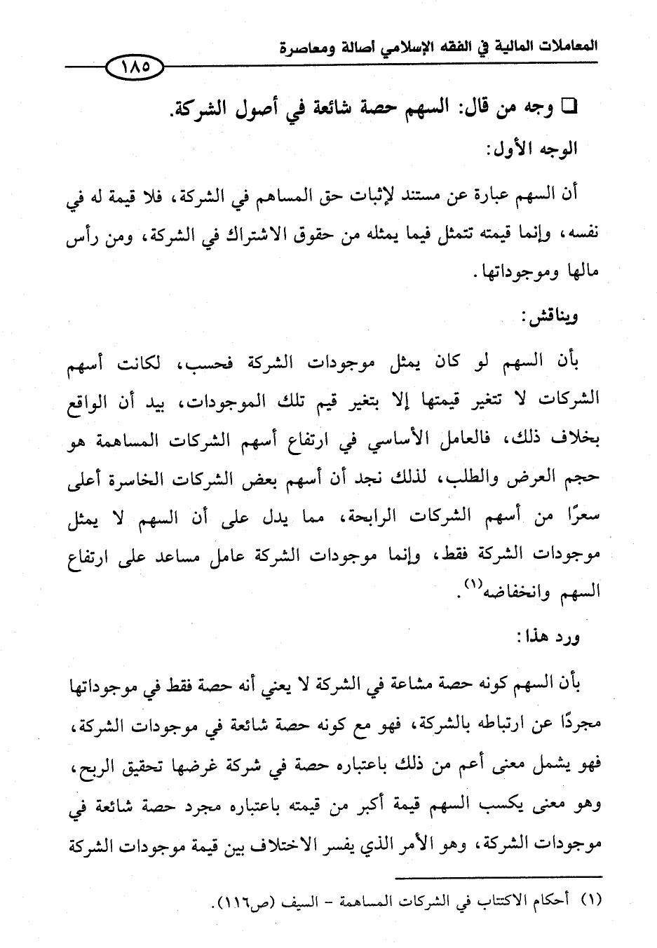 بأن السهم كونه حصة مشاعة في الشركة لا يعني أنه حصة فقط في موجوداتها مجردا عن ارتباطه بالشركة، فهو مع كونه حصة شائعة في موجودات الشركة، فهو يشمل معنى أعم من ذلك باعتباره حصة في شركة غرضها تحقيق الربح، وهو معنى يكسب السهم قيمة أكبر من قيمته باعتباره مجرد حصة شائعة في موجودات الشركة، وهو الأمر الذي يفسر الاختلاف بين قيمة موجودات الشركة