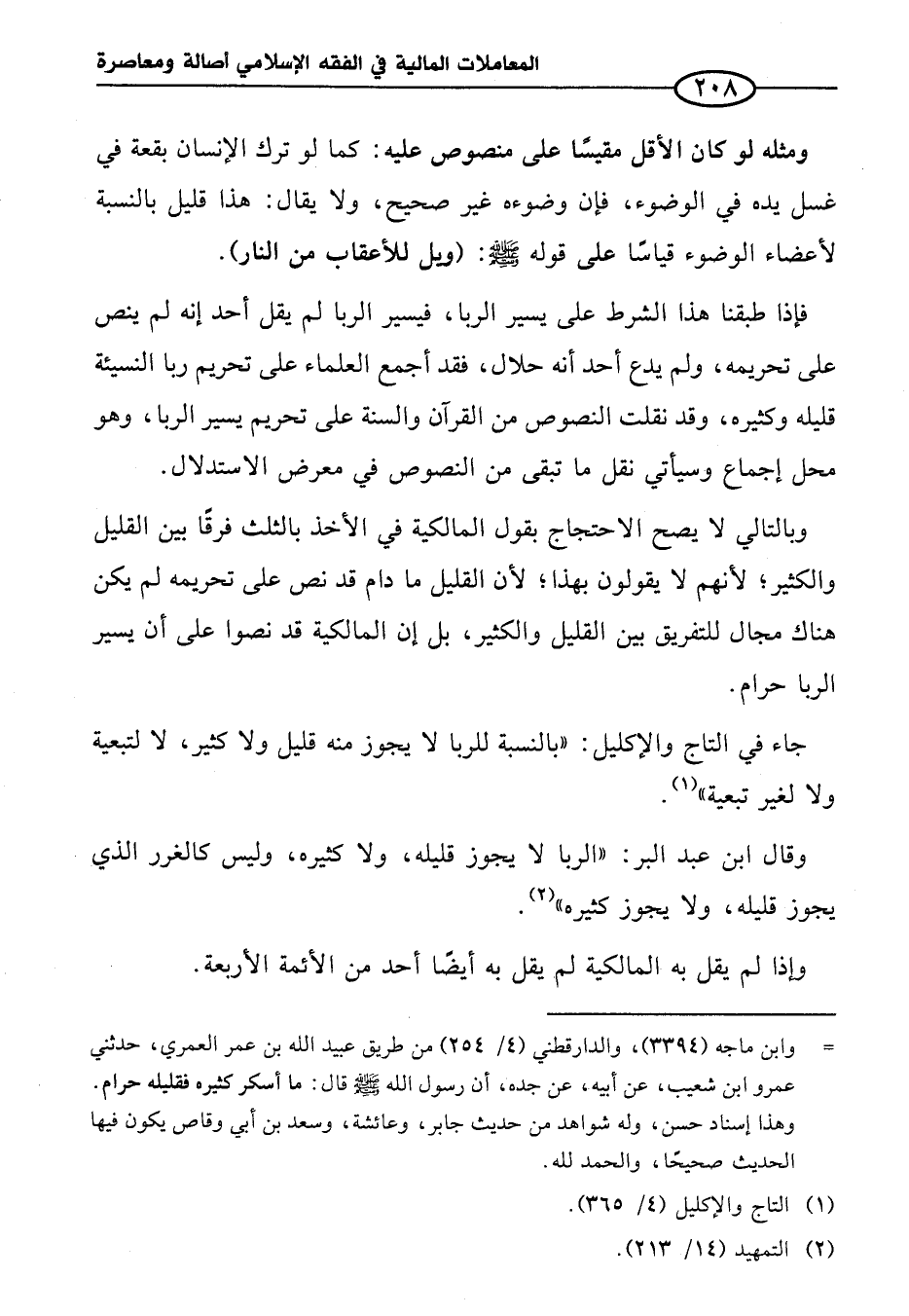 وبالتالي لا يصح الاحتجاج بقول المالكية في الأخذ بالثلث فرقا بين القليل والكثير؛ لأنهم لا يقولون بهذا؛ لأن القليل ما دام قد نص على تحريمه لم يكن هناك مجال للتفريق بين القليل والكثير، بل إن المالكية قد نصوا على أن يسير الربا حرام.