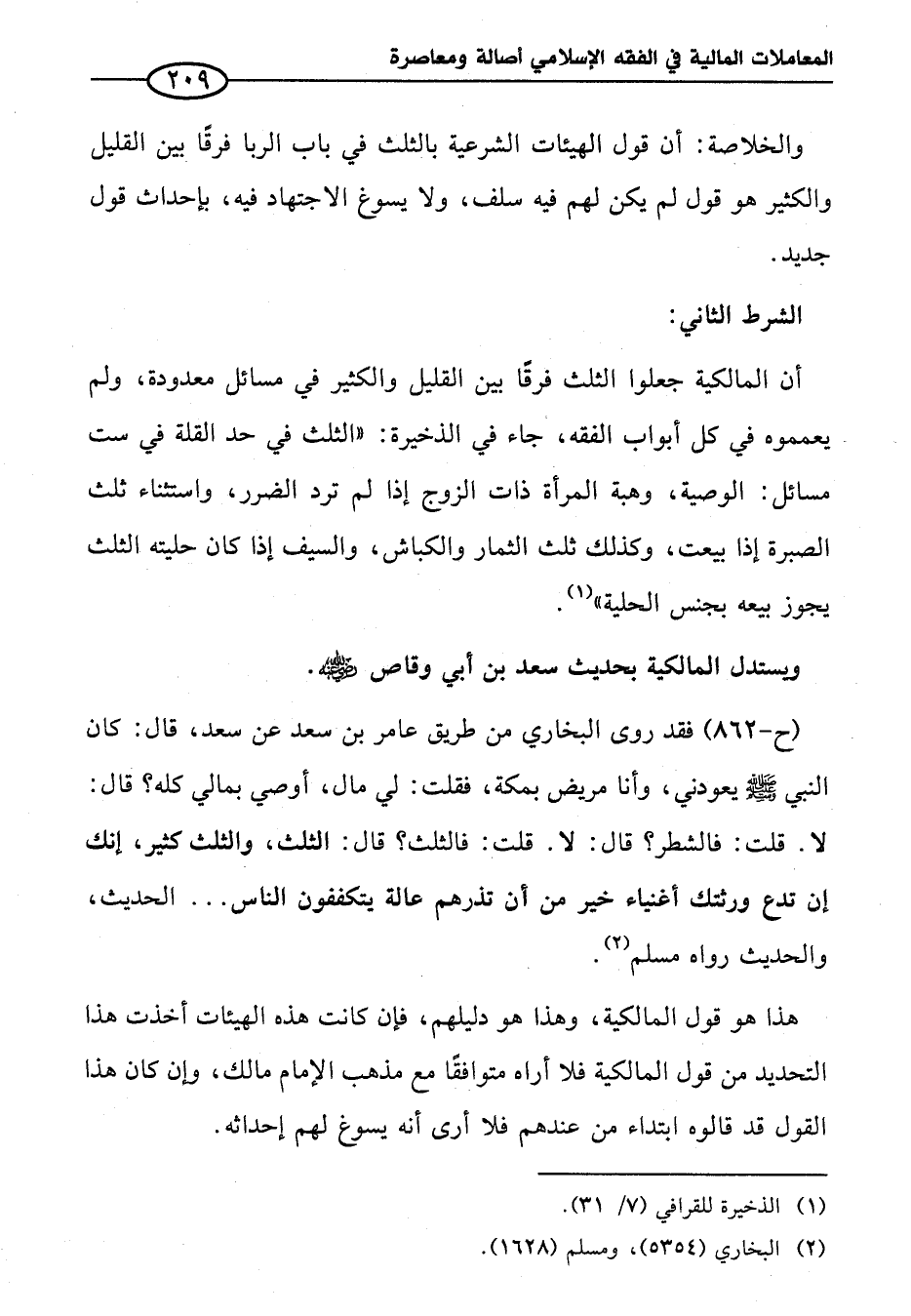 (ح -٨٦٢) فقد روى البخاري من طريق عامر بن سعد عن سعد، قال: كان النبي - صلى الله عليه وسلم - يعودني، وأنا مريض بمكة، فقلت: لي مال، أوصي بمالي كله؟ قال: لا. قلت: فالشطر؟ قال: لا. قلت: فالثلث؟ قال: الثلث، والثلث كثير، إنك إن تدع ورثتك أغنياء خير من أن تذرهم عالة يتكففون الناس ... الحديث، والحديث رواه مسلم (¬٢).