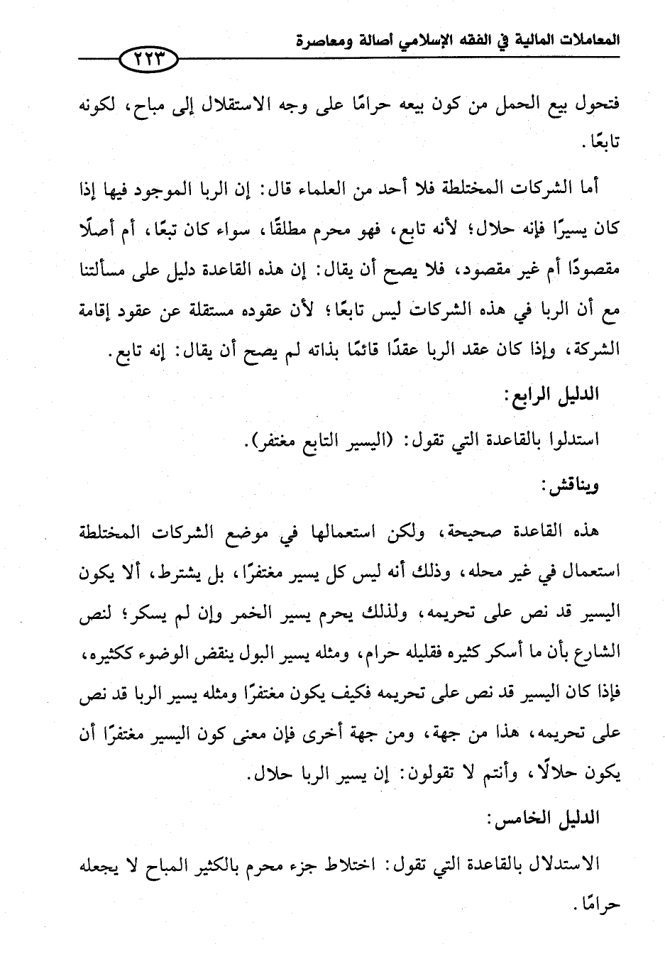 هذه القاعدة صحيحة، ولكن استعمالها في موضع الشركات المختلطة استعمال في غير محله، وذلك أنه ليس كل يسير مغتفرًا، بل يشترط، ألا يكون اليسير قد نص على تحريمه، ولذلك يحرم يسير الخمر وإن لم يسكر؛ لنص الشارع بأن ما أسكر كثيره فقليله حرام، ومثله يسير البول ينقض الوضوء ككثيره، فإذا كان اليسير قد نص على تحريمه فكيف يكون مغتفرًا ومثله يسير الربا قد نص على تحريمه، هذا من جهة، ومن جهة أخرى فإن معنى كون اليسير مغتفرًا أن يكون حلالاً، وأنتم لا تقولون: إن يسير الربا حلال.