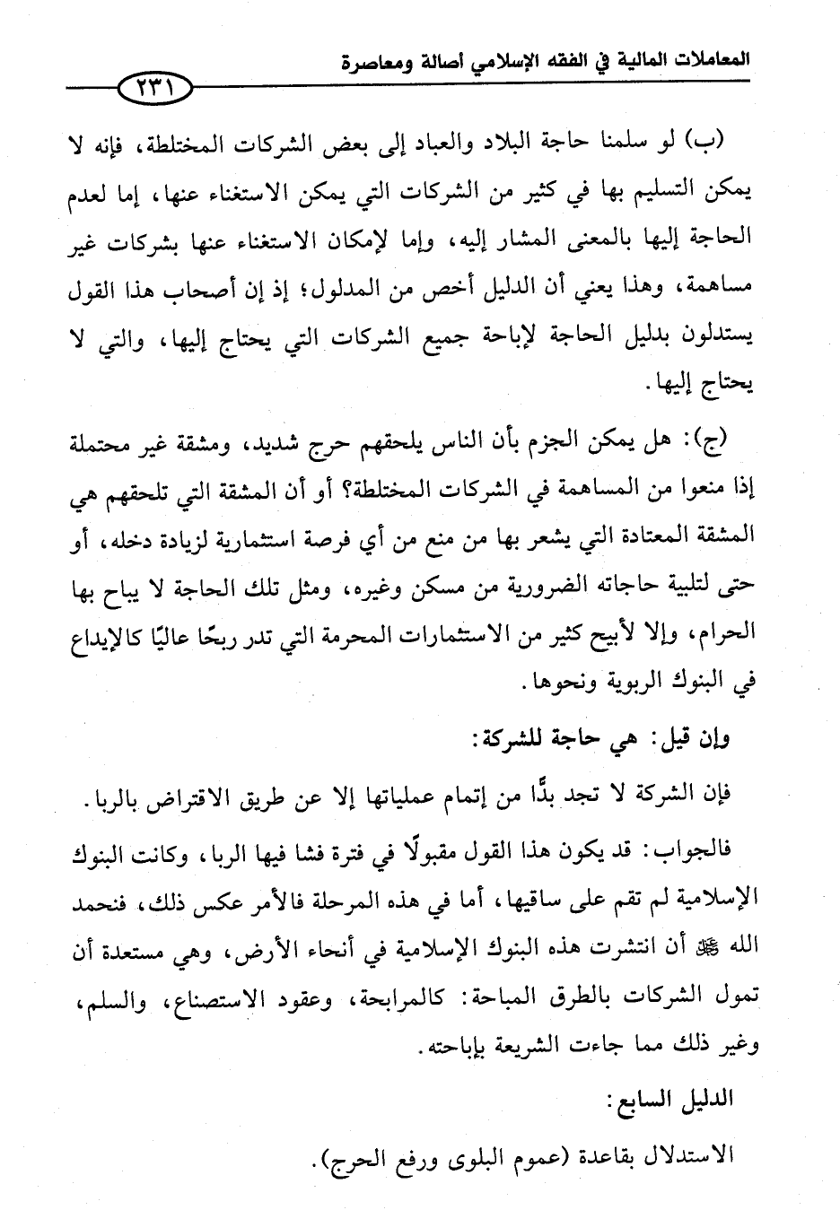 (ج): هل يمكن الجزم بأن الناس يلحقهم حرج شديد، ومشقة غير محتملة إذا منعوا من المساهمة في الشركات المختلطة؟ أو أن المشقة التي تلحقهم هي المشقة المعتادة التي يشعر بها من منع من أي فرصة استثمارية لزيادة دخله، أو حتى لتلبية حاجاته الضرورية من مسكن وغيره، ومثل تلك الحاجة لا يباح بها الحرام، وإلا لأبيح كثير من الاستثمارات المحرمة التي تدر ربحًا عاليًا كالإيداع في البنوك الربوية ونحوها.