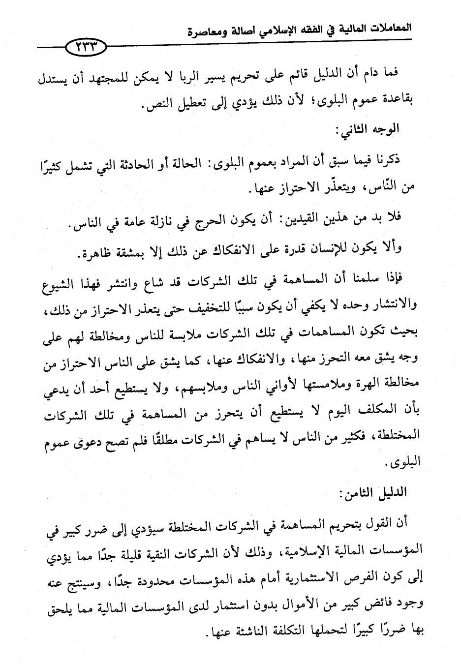 فإذا سلمنا أن المساهمة في تلك الشركات قد شاع وانتشر فهذا الشيوع والانتشار وحده لا يكفي أن يكون سببا للتخفيف حتى يتعذر الاحتراز من ذلك، بحيث تكون المساهمات في تلك الشركات ملابسة للناس ومخالطة لهم على وجه يشق معه التحرز منها، والانفكاك عنها، كما يشق على الناس الاحتراز من مخالطة الهرة وملامستها لأوانى الناس وملابسهم، ولا يستطيع أحد أن يدعي بأن المكلف اليوم لا يستطيع أن يتحرز من المساهمة في تلك الشركات المختلطة، فكثير من الناس لا يساهم في الشركات مطلقا فلم تصح دعوى عموم البلوى.