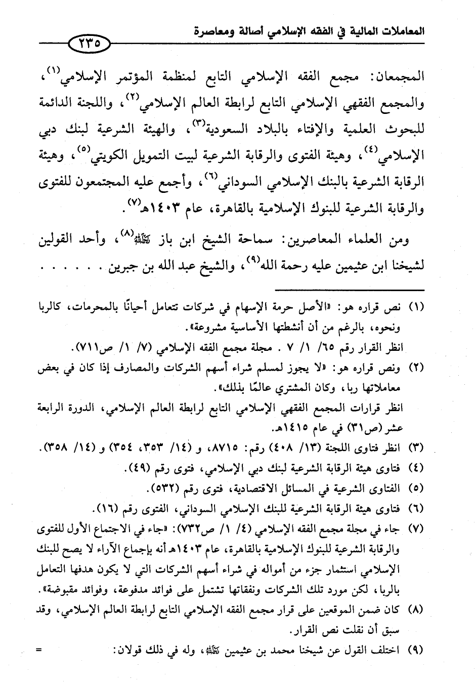 (¬٢) ونص قراره هو: "لا يجوز لمسلم شراء أسهم الشركات والمصارف إذا كان في بعض معاملاتها ربا، وكان المشتري عالماً بذلك".