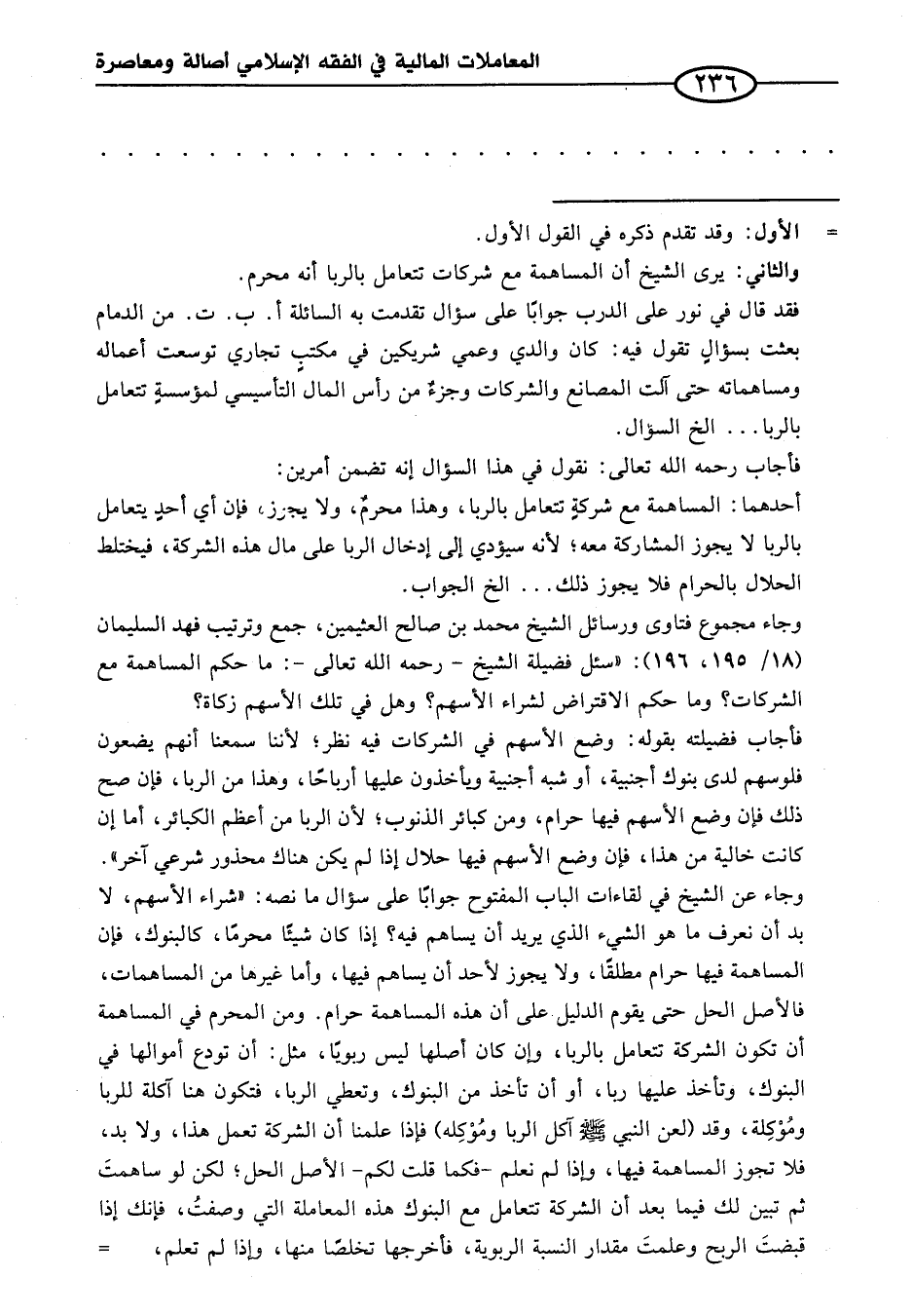 فأجاب فضيلته بقوله: وضع الأسهم في الشركات فيه نظر؛ لأننا سمعنا أنهم يضعون فلوسهم لدى بنوك أجنبية، أو شبه أجنبية ويأخذون عليها أرباحًا، وهذا من الربا، فإن صح ذلك فإن وضع الأسهم فيها حرام، ومن كبائر الذنوب؛ لأن الربا من أعظم الكبائر، أما إن كانت خالية من هذا، فإن وضع الأسهم فيها حلال إذا لم يكن هناك محذور شرعي آخر". وجاء عن الشيخ في لقاءات الباب المفتوح جوابًا على سؤال ما نصه: "شراء الأسهم، لا بد أن نعرف ما هو الشيء الذي يريد أن يساهم فيه؟ إذا كان شيئًا محرمَا، كالبنوك، فإن المساهمة فيها حرام مطلقاً، ولا يجوز لأحد أن يساهم فيها، وأما غيرها من المساهمات، فالأصل الحل حتى يقوم الدليل على أن هذه المساهمة حرام. ومن المحرم في المساهمة أن تكون الشركة تتعامل بالربا، وإن كان أصلها ليس ربويا، مثل: أن تودع أموالها في البنوك، وتأخذ عليها ربا، أو أن تأخذ من البنوك، وتعطي الربا، فتكون هنا آكلة للربا ومُوْكِلة، وقد (لعن النبي - صلى الله عليه وسلم - آكل الربا وموْكِله) فإذا علمنا أن الشركة تعمل هذا, ولا بد، فلا تجوز المساهمة فيها، وإذا لم نعلم - فكما قلت لكم - الأصل الحل , لكن لو ساهمتَ ثم تبين لك فيما بعد أن الشركة تتعامل مع البنوك هذه المعاملة التي وصفت، فإنك إذا قبضتَ الربح وعلمتَ مقدار النسبة الربوية، فأخرجها تخلصًا منها، وإذا لم تعلم، =