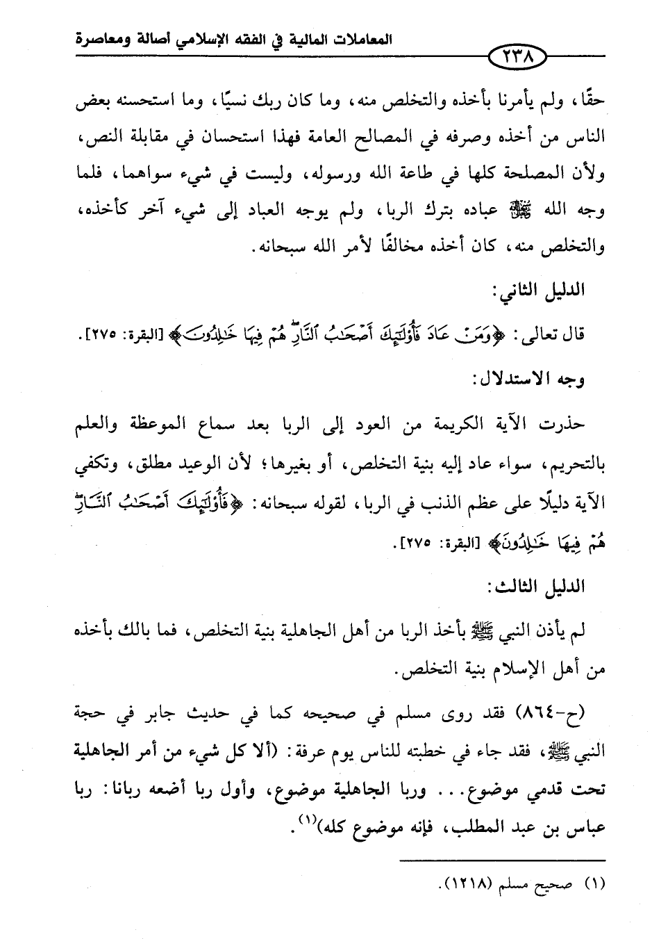 (ح -٨٦٤) فقد روى مسلم في صحيحه كما في حديث جابر في حجة النبي - صلى الله عليه وسلم -، فقد جاء في خطبته للناس يوم عرفة: (ألا كل شيء من أمر الجاهلية تحت قدمي موضوع ... وربا الجاهلية موضوع، وأول ربا أضعه ربانا: ربا عباس بن عبد المطلب، فإنه موضوع كله) (¬١).