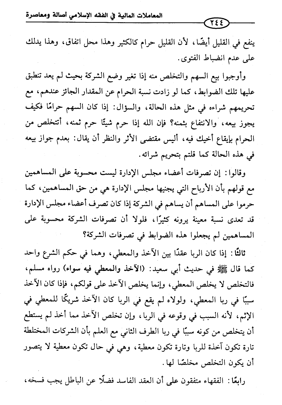 ثالثًا: إذا كان الربا عقدًا بين الآخذ والمعطي، وهما في حكم الشرع واحد كما قال - صلى الله عليه وسلم - في حديث أبي سعيد: (الآخذ والمعطي فيه سواء) رواه مسلم، فالتخلص لا يخلص المعطي، وإنما يخلص الآخذ على قولكم، فإذا كان الآخذ سبباً في ربا المعطي، ولولاه لم يقع في الربا كان الآخذ شريكًا للمعطي في الإثم؛ لأنه السبب في وقوعه في الربا، وإن تخلص الآخذ مما أخذ لم يستطع أن يتخلص من كونه سبباً في ربا الطرف الثاني مع العلم بأن الشركات المختلطة تارة تكون آخذة للربا وتارة تكون معطية، وهي في حال تكون معطية لا يتصور أن يكون التخلص مخلصًا لها.