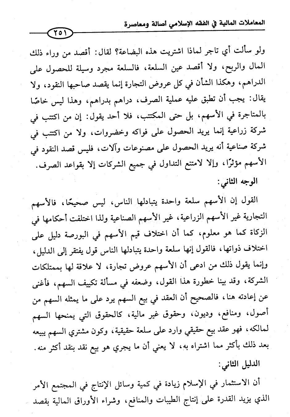 ولو سألت أي تاجر لماذا اشتريت هذه البضاعة؟ لقال: أقصد من وراء ذلك المال والربح، ولا أقصد عين السلعة، فالسلعة مجرد وسيلة للحصول على الدراهم، وهكذا الشأن في كل عروض التجارة إنما يقصد صاحبها النقود، ولا يقال: يجب أن تطبق عليه عملية الصرف، دراهم بدراهم، وهذا ليس خاصا بالمتاجرة في الأسهم، بل حتى المكتتب، فلا أحد يقول: إن من اكتتب في شركة زراعية إنما يريد الحصول على فواكه وخضروات، ولا من اكتتب في شركة صناعية أنه يريد الحصول على مصنوعات وآلات، فليس قصد النقود في الأسهم مؤثرًا، وإلا لامتنع التداول في جميع الشركات إلا بقواعد الصرف.