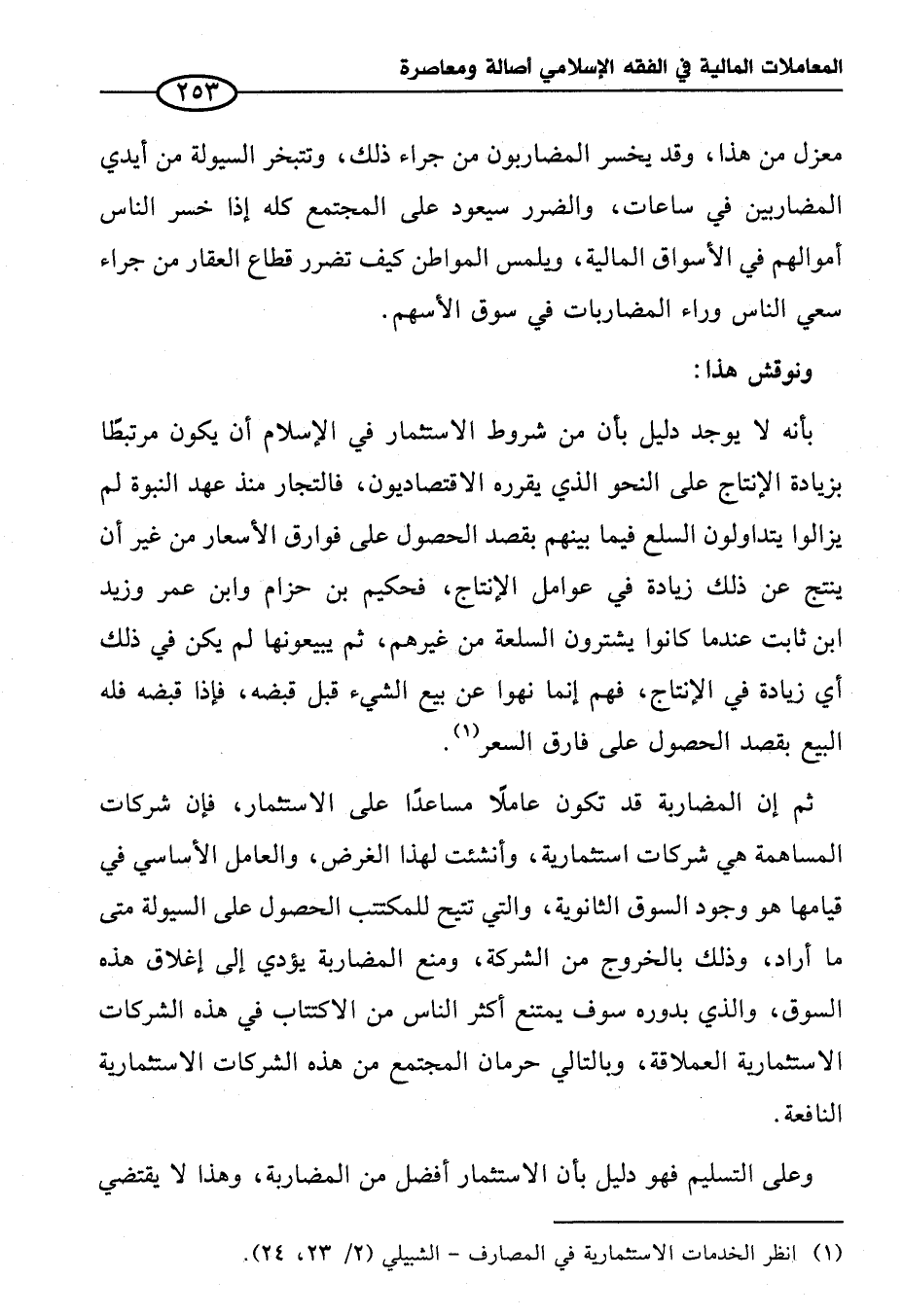 بأنه لا يوجد دليل بأن من شروط الاستثمار في الإِسلام أن يكون مرتبطا بزيادة الإنتاج على النحو الذي يقرره الاقتصاديون، فالتجار منذ عهد النبوة لم يزالوا يتداولون السلع فيما بينهم بقصد الحصول على فوارق الأسعار من غير أن ينتج عن ذلك زيادة في عوامل الإنتاج، فحكيم بن حزام وابن عمر وزيد ابن ثابت عندما كانوا يشترون السلعة من غيرهم، ثم يبيعونها لم يكن في ذلك أي زيادة في الإنتاج، فهم إنما نهوا عن بيع الشيء قبل قبضه، فإذا قبضه فله البيع بقصد الحصول على فارق السعر (¬١).